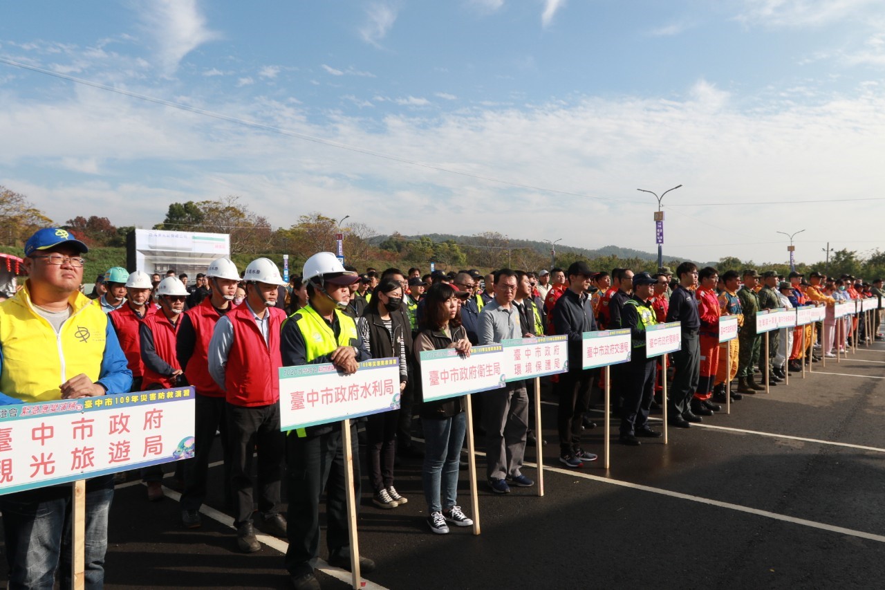 「2020台灣燈會緊急應變演練暨台中市109年災害防救演習」在后里區友達光電P2停車場舉辦,由后里區公所區長賴同一擔任指揮官,陳副市長在消防局長曾進財、社會局長彭懷真陪同下視察演練過程,中央則由內政部政務次長陳宗彥率相關部會評核官視察,盼透過強化演練,平時多一分準備、災時少一分災害。(1/22*18)*消防局
