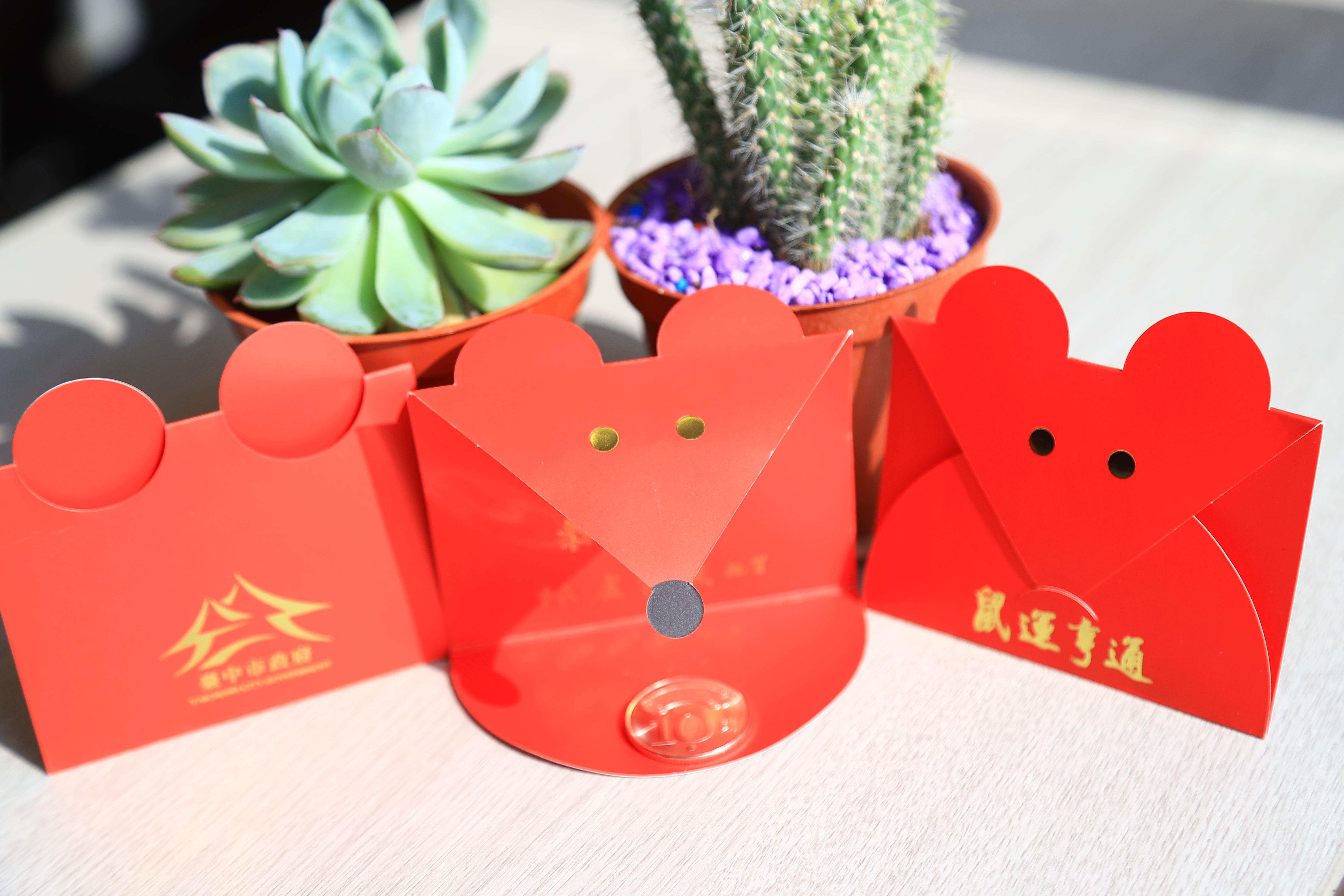 2020農曆春節將到來,台中市長盧秀燕將於1月25日(初一)、1月26日(初二)兩日到台中9間宮廟發送印有「鼠運亨通」的春節小紅包,今年以「錢鼠」造型象徵財運到來,並加值升級為10元硬幣,歡迎市民朋友到宮廟走春,領紅包討吉利。