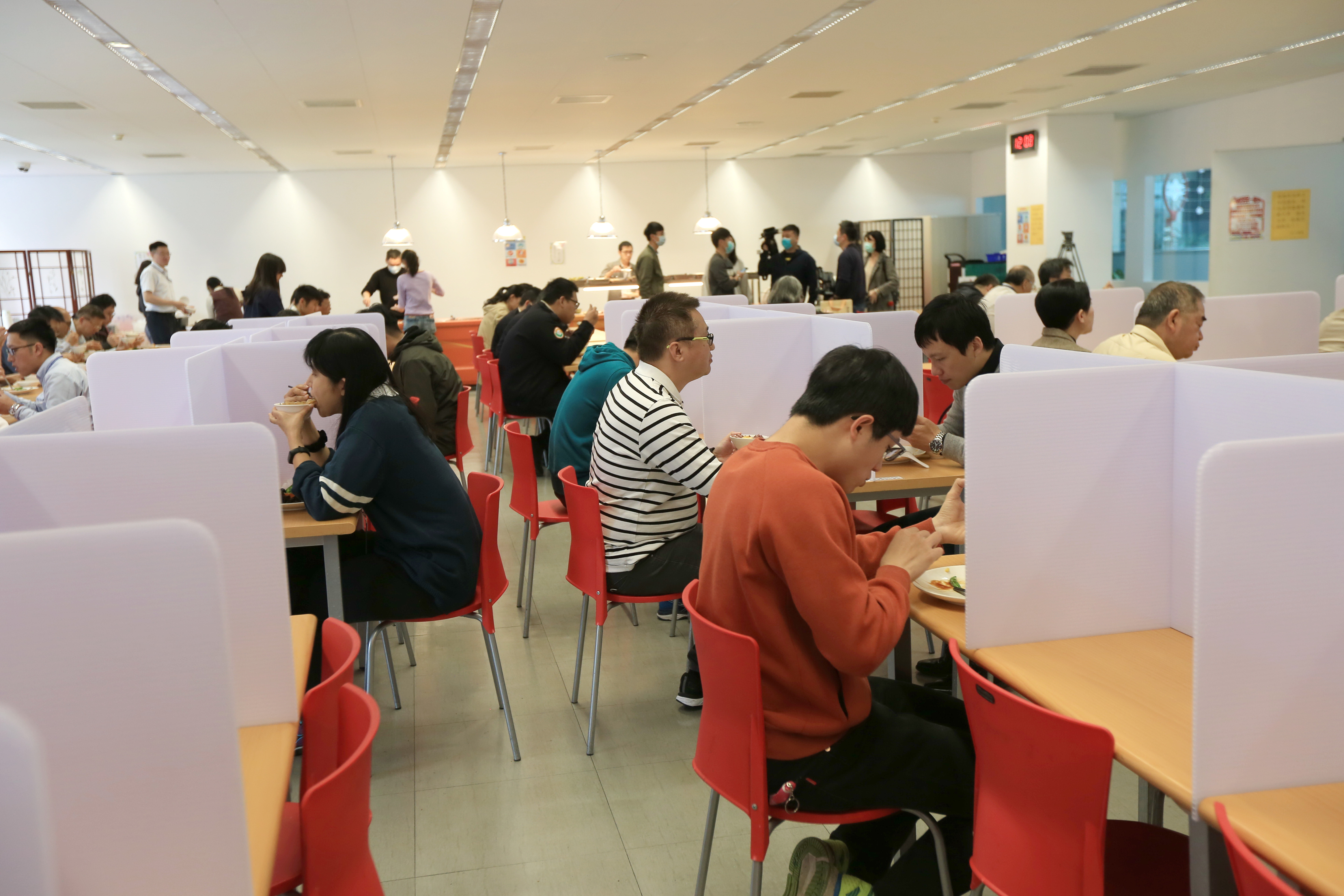 市府員工餐廳老闆顧先生也說,防疫是特別時期,員工餐廳每日完成內用座位消毒及櫃位清潔消毒,每月市府也委請專業消毒廠商進行環境大消毒,今日加上分流制度及隔板用餐,讓大家都安心。市府員工也強調,座位加裝隔板,吃飯確實會比較安心,特別時期,大家共體時艱、互相配合,保護自己、也保護他人。(3/16*18)*秘書處