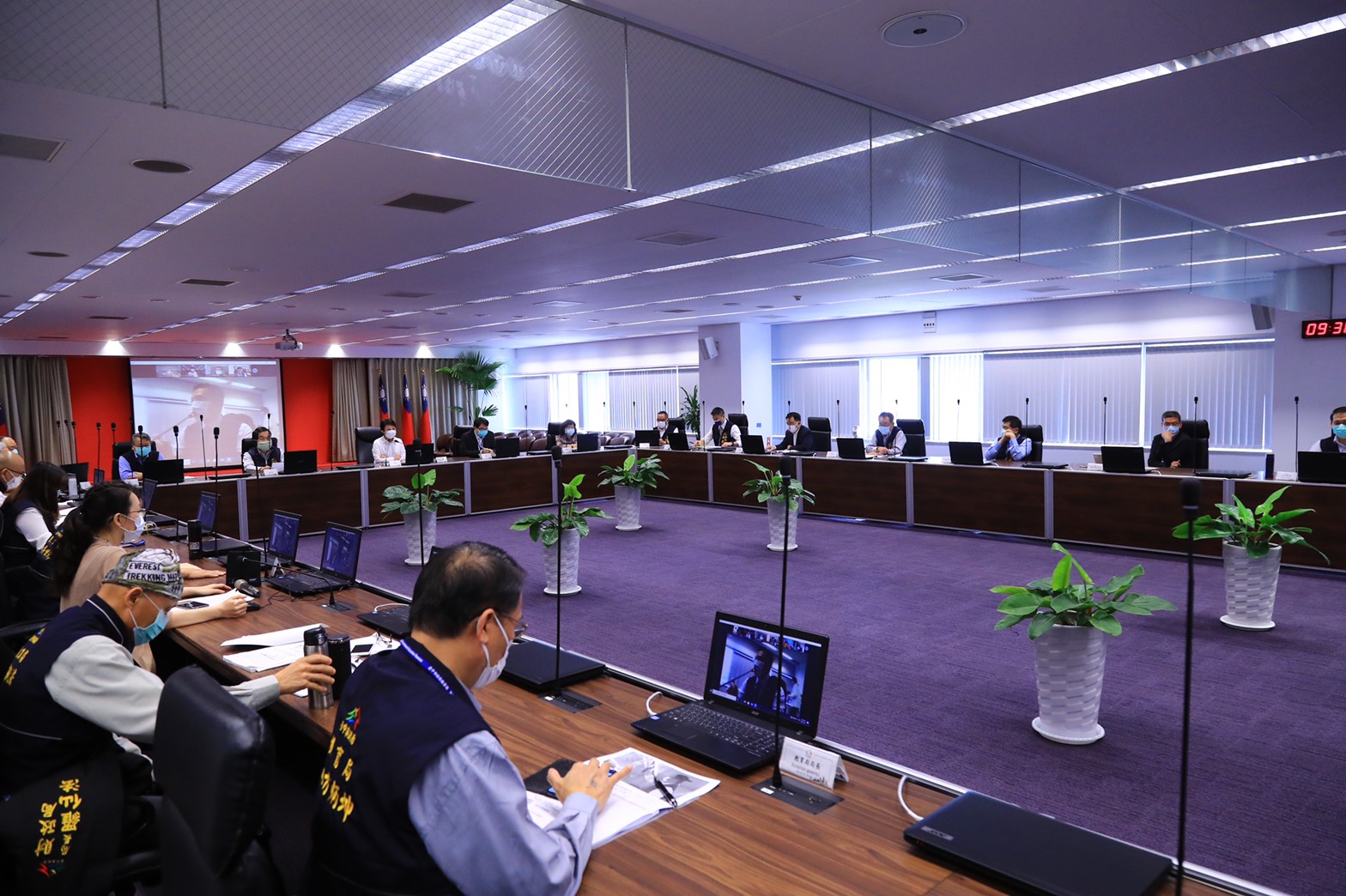 台中市政府防疫再升級!今(24)日召開市政會議,首次以「視訊」與各區長連線開會,居家自主健康管理的都發局長黃文彬也參與視訊連線,感謝各界對他的關心,會議中並採取多項防疫作為,包括梅花座保持間隔、全員全程戴口罩、限制會議人數等。市長盧秀燕表示,市府會做最好示範,一起守護城市安全。