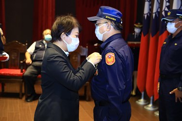 「城市防疫英雄!」盧市長表示,台中幸福感六都第二,與防疫、經濟、抗空汙等成效有關。防疫方面,除了衛生、民政系統,更需要警察系統支援協勤,如確診對象疫調複查、嚴查囤積及哄抬防疫物資業者、柔性勸導稽查近百家酒店舞廳及陪侍營業場所等。她說,警察同仁永遠站在第一線,守護城市安全。