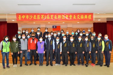 沙鹿區第3屆第1、2任里長聯誼會今(29)日在沙鹿區公所禮堂舉行會長交接典禮,新任會長由公明里里長蔡水松接任,並由沙鹿區長廖財崇監交。民政局長吳世瑋代表市長盧秀燕前往見證,除感謝卸任會長斗抵里里長王宏書用心推動區里及市政,也期許新任會長蔡里長積極推動里長們之間的交流與連繫,繼續凝聚力量,帶動沙鹿區發展。