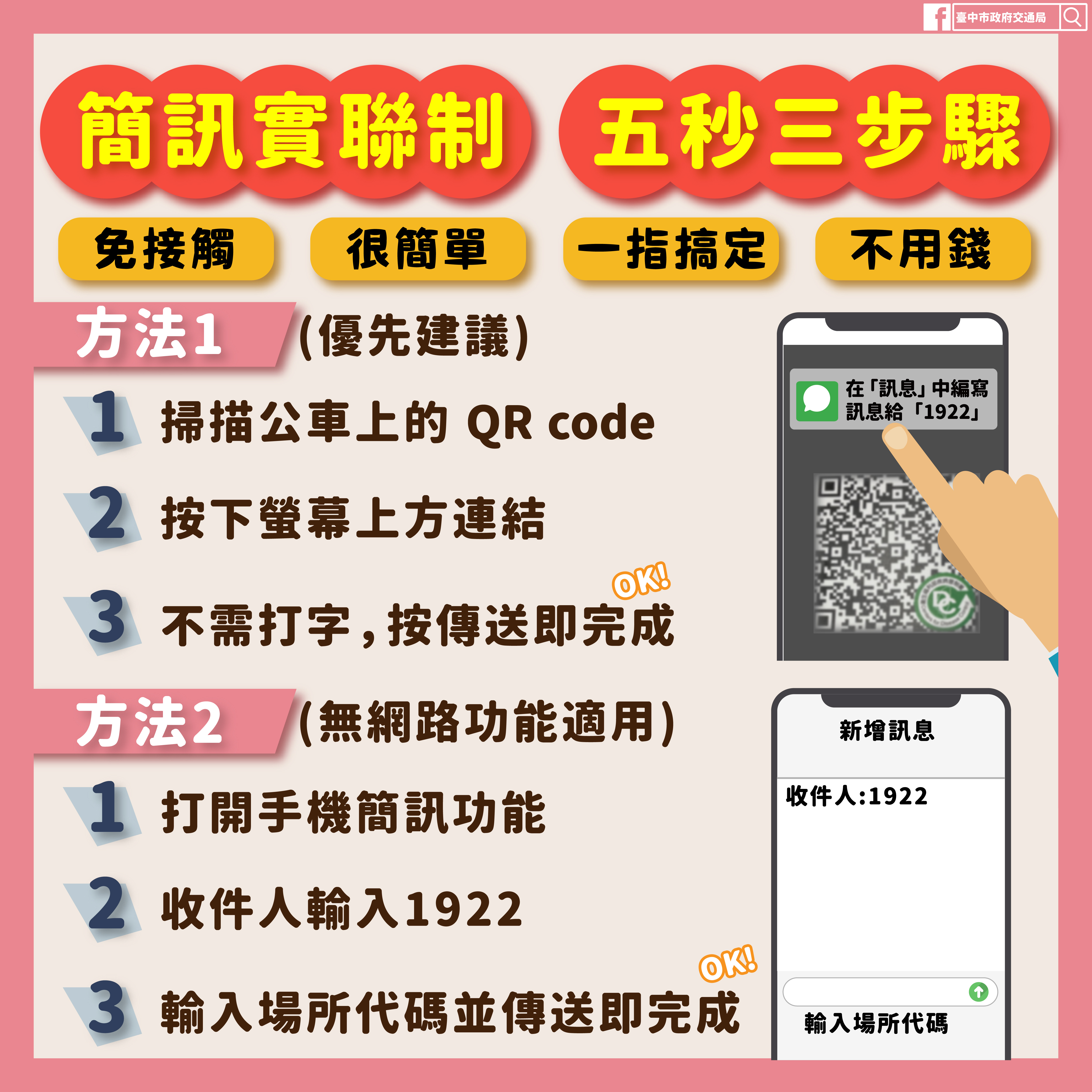 國內疫情升溫,為杜絕大眾運輸防疫破口,台中市政府交通局配合行政院研發簡訊實聯制,明(21)日起雙管實施台中市公車實聯制,每輛公車車門皆會張貼QR Code及使用說明,供民眾掃描,掃描後按下連結,並在簡訊程式傳送自動跳出代碼到1922就完成實聯制;同時除了車輛自身消毒外,在全市公車車上全面提供酒精,供乘客消毒使用,更多一層保護,全力守護民眾健康。