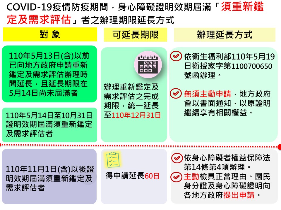 疫情升溫,全國進入三級警戒,為減少身心障礙者出入醫療機構等高風險場域,台中市政府社會局表示,依照衛福部公告,若今年513日以前已向地方政府申請重新鑑定及延長需求評估,且延長期限在514日尚未屆滿者;以及今年514日至1031日證明效期屆滿,須重新鑑定及需求評估者,皆可將身障證明效期統一延長至今年1231日。社會局將會以書面通知,民眾無須主動申請,可以原證明繼續享有相關權益和已領有補助。