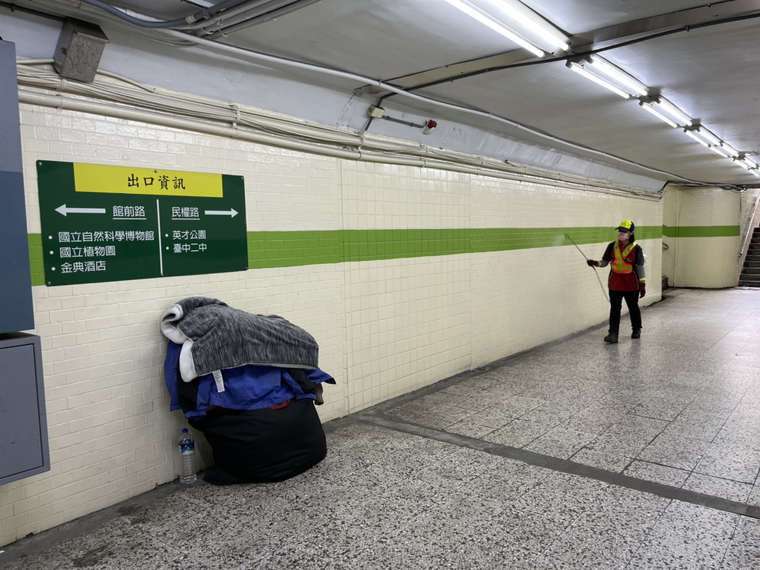新冠肺炎疫情嚴峻,為降低傳播風險,台中市政府環保局與社會局攜手合作,執行「街友關懷專案」,昨(20)日環保局動員4區清潔隊,計13名防疫消毒人員,出動背負式噴霧機8台及水霧式消毒車5輛,針對火車站、公園等23處街友聚集區域,進行地毯式環境消毒;社會局也提供手部消毒及主動發放口罩予街友,提醒市民配合政府防疫措施,保護自己也保護他人。