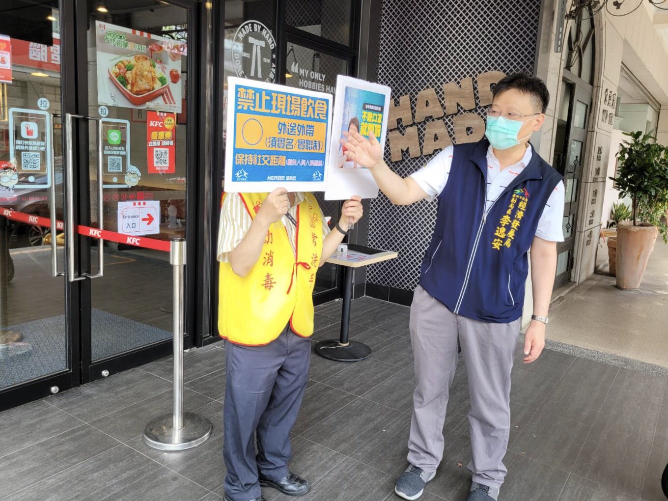 國內疫情急劇升溫,全台警戒升至第三級,台中市昨日宣布,自即日起至68日止,全市餐飲業禁止現場飲食,店外也不能脫下口罩飲食,一律採用實名實聯制外送、外帶。對於勸導後仍拒絕配合的餐飲業者,將依《傳染病防治法》開立裁處單,處3000元以上15000元以下罰鍰。經發局副局長李逸安今(22)日率隊至草悟道、市民廣場周邊稽查與宣導防疫措施。
