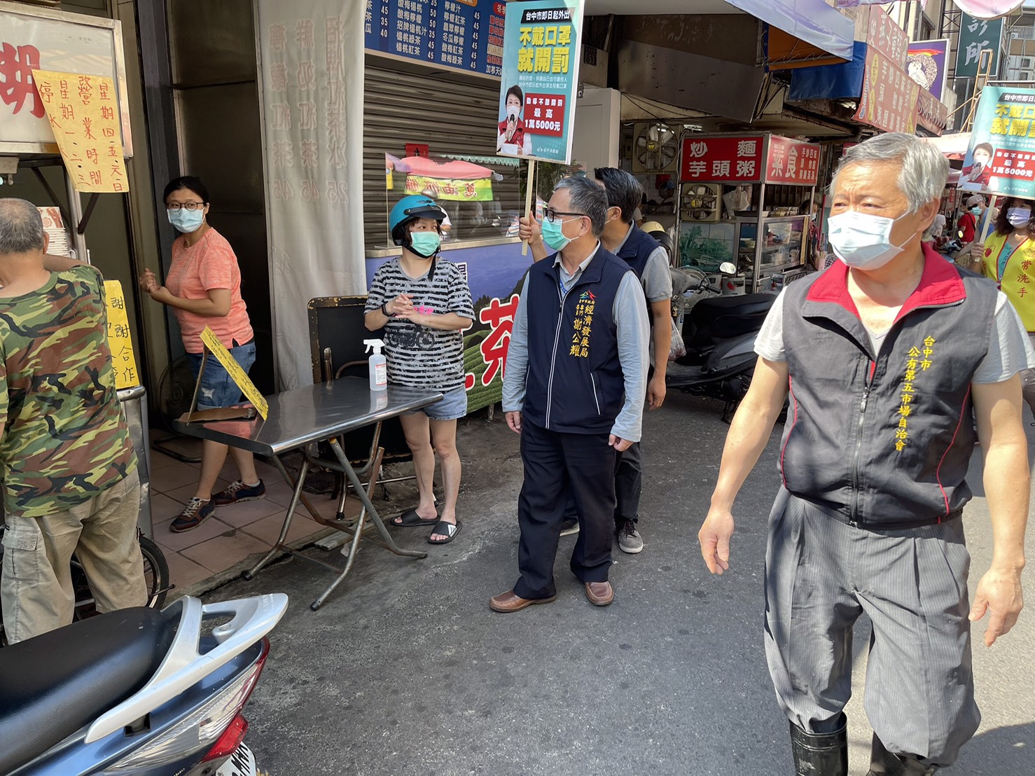防疫沒有假期!全國疫情已升至三級警戒,台中市政府防疫沒有假期,經發局今(23)日兵分兩路,分別由專門委員謝公耀與林敏棋率員至台中市第五公有零售市場、逢甲商圈,加強稽查攤商、店家及消費者佩戴口罩及外帶外送實聯制落實情形,對於部分民眾未戴好口罩,經勸導後均配合戴好,店家也都配合暫停內用,一同落實防疫規範。