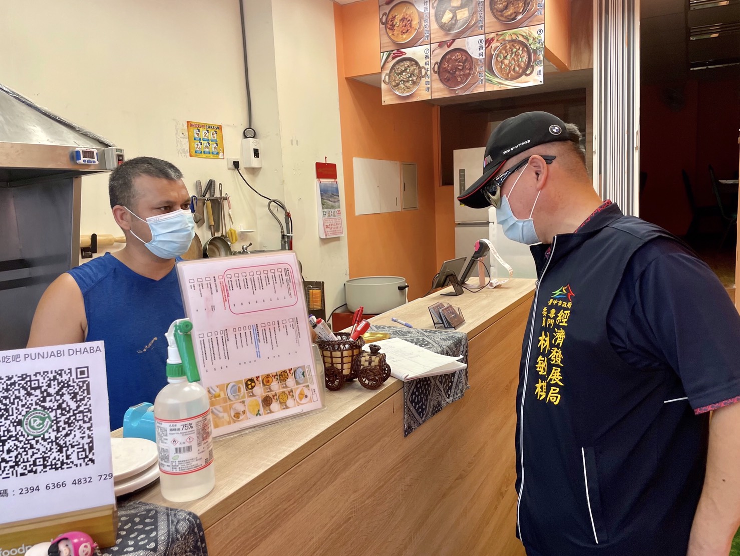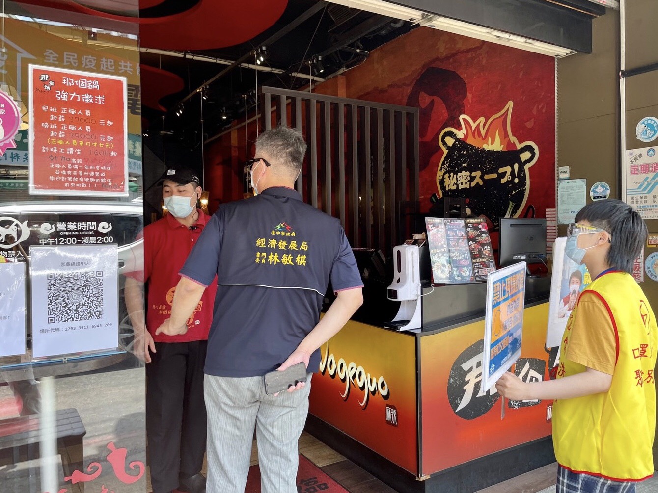 經發局進一步表示,經發局謝專委今日上午帶隊到第五公有零售市場及周邊自立街、大明街、自治街、樂群街等沿街店家稽查,發現有5位民眾未確實將口罩戴好,當場立即勸導,民眾也配合拉至鼻樑上方,整個稽查過程未發現完全未佩戴口罩者;此外,林專委也率隊至逢甲商圈及周邊店家進行稽查及宣導,總計宣導7家店家,皆已配合暫停內用,並配合外帶實聯制規定,於入口設置明顯店家QR Code。