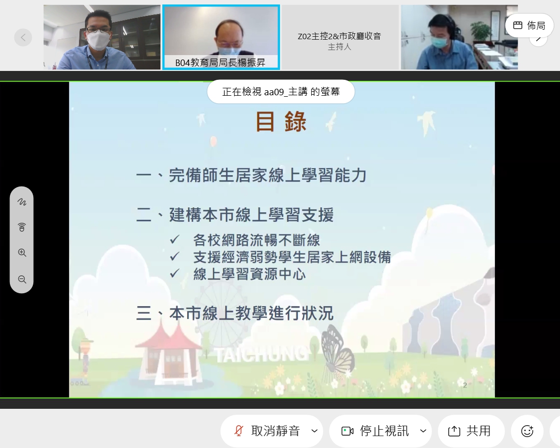 教育部宣布自今年5月19日起至5月28日止,全國各級學校及公私立幼兒園停止到校上課。市府教育局長楊振昇今日於市政會議提出「台中市因應各校停課期間停課不停學之作法」專案報告,說明因應全國性停課各項作為。
