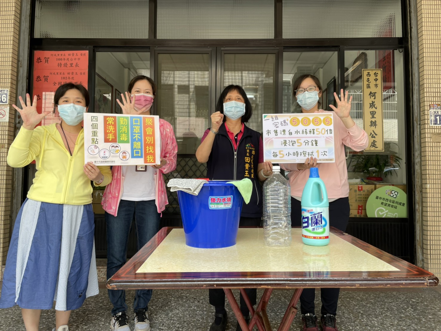 新冠肺炎疫情持續延燒,台中市政府環境保護局日前推出的防疫「5055消毒法」深獲好評,西屯區何成里、西區安龍里及霧峰區萬峰里等3位里長率先響應,透過拍攝影片向里民遠距教學,親自示範自製居家簡易消毒水,並仔細擦拭里辦公處及室內環境中容易用手碰觸到的物體表面,呼籲市民一起動手落實室內環境消毒,減少疫情傳播風險。