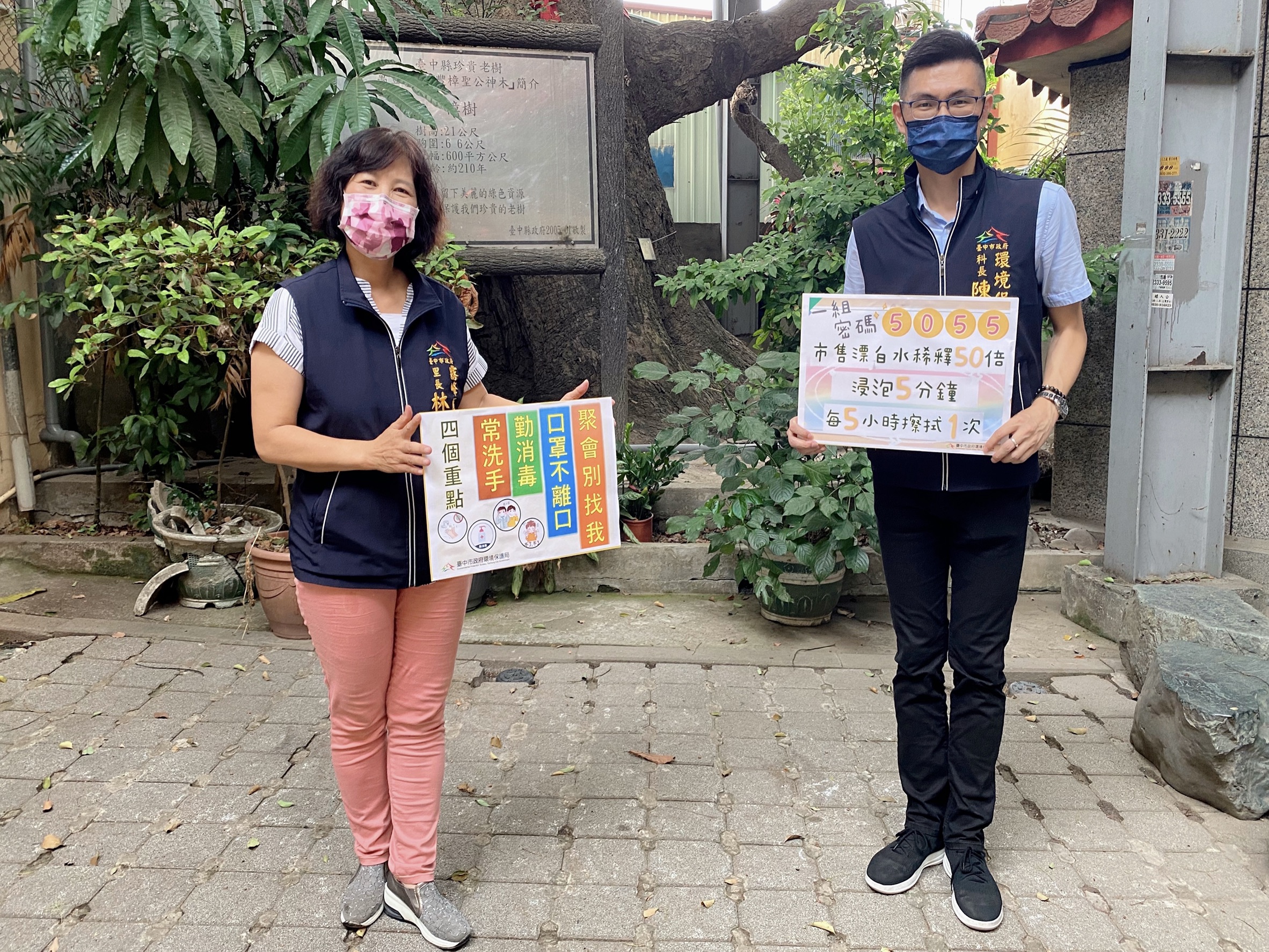 霧峰區萬峰里里長林麗真則呼籲防疫大家一起來,尤其是門把、鞋櫃、茶几、餐桌、座椅是手或身體最常碰觸的地方,利用「5055消毒法」自製簡易消毒水定時擦拭這些物品表面,就可以達到很好的消毒效果,安全又有效。