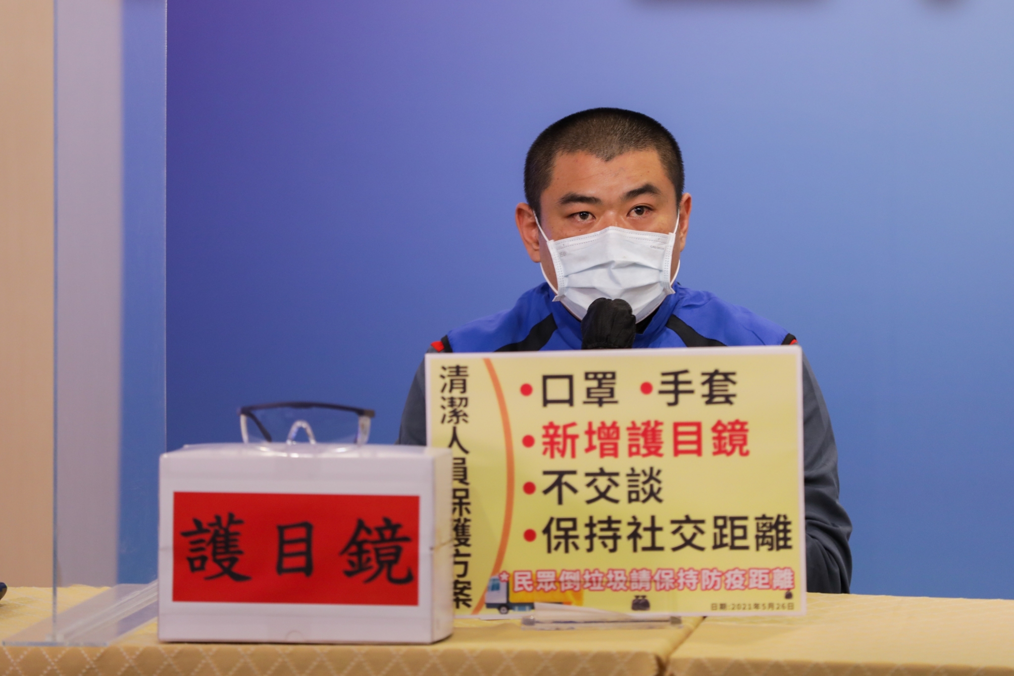環保局長陳宏益表示,「清潔人員保護方案」讓清潔同仁除了戴口罩及手套外,再增加護目鏡配戴,多一層防護多一分保障,也再次提醒民眾倒垃圾時務必戴好口罩,一同力抗疫情。(5/26*17)*環保局