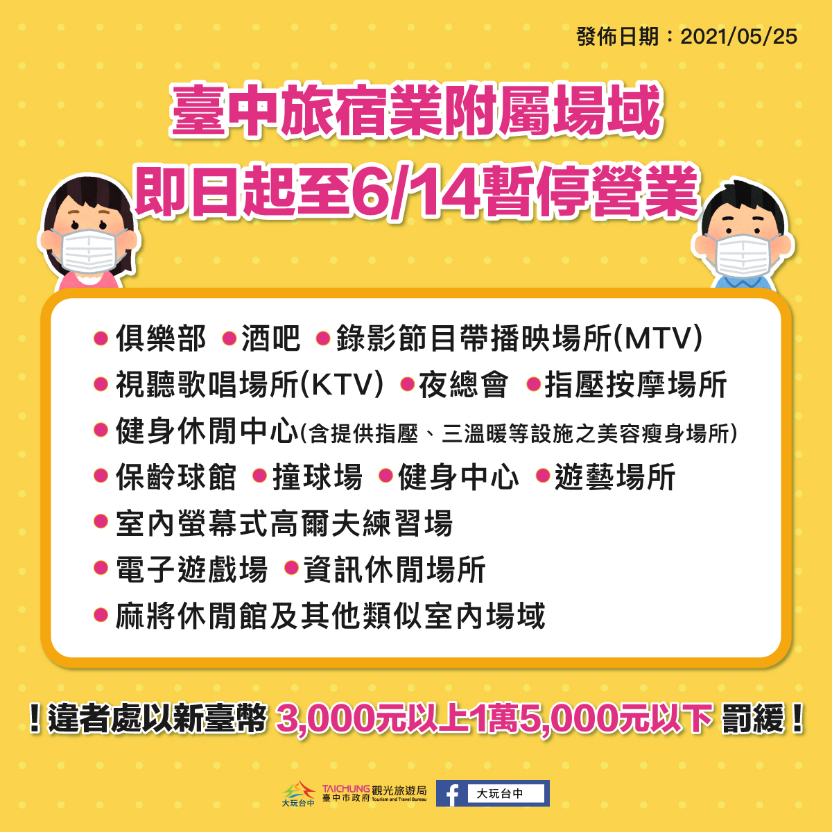 觀旅局強調,疫情期間請減少聚集、聚會,注意社交安全距離,若違規且拒絕改善,將依傳染病防治法第70條第1項第3款規定裁處新台幣3千元以上1萬5千元以下罰鍰。請民眾務必配合防疫相關管制措施,暫緩出遊,出門佩戴口罩,一起做好防疫工作,保障健康安全。(5/26*8)*觀光旅遊局