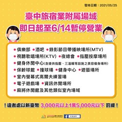 觀旅局指出,為避免造成防疫破口,已請草悟廣場富地市集營運廠商配合延長暫停營業至6月14日,台中旅宿業附屬場域也將同步暫停營業,包括俱樂部、酒吧、錄影節目帶播映場所(MTV)、視聽歌唱場所(KTV)、夜總會、指壓按摩場所、健身休閒中心(含提供指壓、三溫暖等設施之美容瘦身場所)、保齡球館、撞球場、健身中心、室內螢幕式高爾夫練習場、遊藝場所、電子遊戲場、資訊休閒場所、麻將休閒館及其他類似室內場域),也請民眾配合確保安全,共同為防疫盡一份心力。