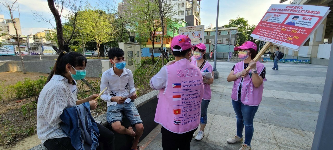 新冠肺炎疫情升溫,為讓移工也能落實防疫並獲得疫情資訊,台中市政府勞工局至移工常聚集處,包括東協廣場、台中火車站及台中公園等地進行宣導,同時製作越南、印尼、泰國及英文等語言版本防疫文宣,並錄製語音廣播,提供雇主及店家運用,相關疫情資訊也即時更新於市府勞工局網站,呼籲大家一同做好防疫工作,度過疫情難關。