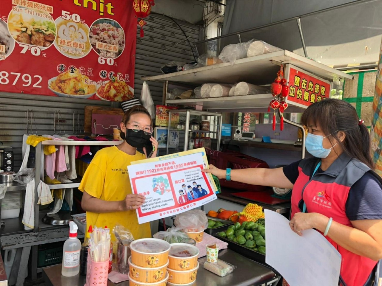 勞工局長張大春表示,台中市移工人數約10萬6千多人,為全國第二多的城市,因應這波疫情升溫,為讓移工得以即時獲知相關防疫資訊,勞工局印製四國語言宣導海報,提醒移工朋友落實實名制、保持社交距離、勤洗手、不戴口罩就開罰、東協廣場自主停業請勿前往等資訊,並錄製四國語言廣播,請仲介公會提供雇主運用,以及提供台中市大眾運輸、各商圈管理委員會、公園、醫院、宗教團體等主管機關使用。
