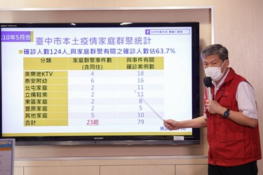 衛生局長曾梓展進一步說明,台中市家庭群聚感染相關性強烈,根據疫情趨勢分析,全市今年累計124例本土確診個案,其中美樂地KTV 4家庭群聚、累計18人,西屯泰安國小6家庭群聚、累計16人,東區2家庭群聚、累計8人,豐原區2家庭群聚、累計5人,潭子立揚鞋業2家庭群聚、累計11人,北屯區2家庭群聚、累計11人,另有其他5起零星家庭群聚、累計10人確診,全數共23起家庭群聚、79人確診,就佔6成3。