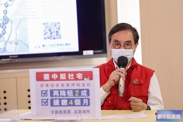 台中市政府今日下午召開流行疫情指揮中心線上記者會,盧市長說明,日前市府因應疫情,已辦理社會住宅租金緩繳紓困方案,但這波新冠肺炎疫情持續延燒,且第三級警戒戰線拉長,造成各界企業主、受雇人或自營工作者持續受不景氣衝擊影響收入,因此市府「以身作則」挺房客,希望能帶頭減少社會住宅租金,各局處會也將盤點所屬場域實施減租行動,並依疫情滾動式調整。