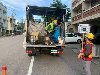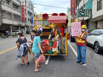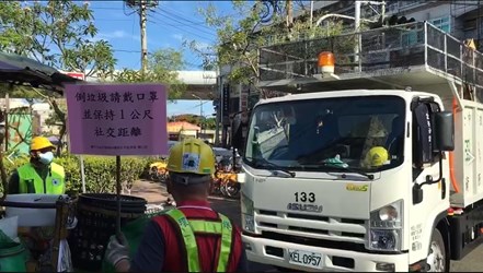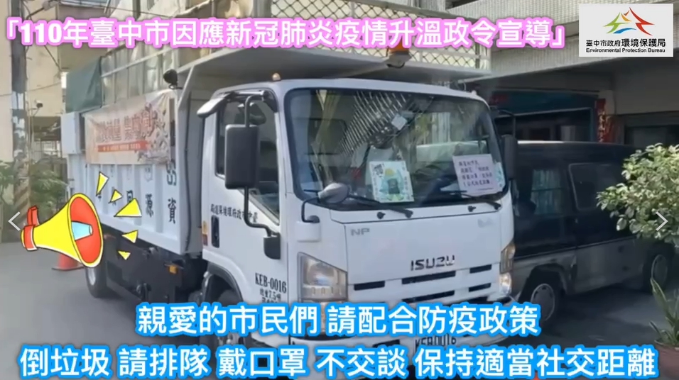 國內疫情進入三級警戒,民眾外出須全程戴口罩,台中市政府環境保護局防疫不鬆懈,除了派員至垃圾收運現場,舉牌提醒民眾倒垃圾戴口罩、保持社交距離外,近日更邀請市長盧秀燕親自錄製一段音檔,於資源回收車行進間,廣播宣導市民戴口罩、勤洗手,做好居家環境消毒,全力防堵疫情。
