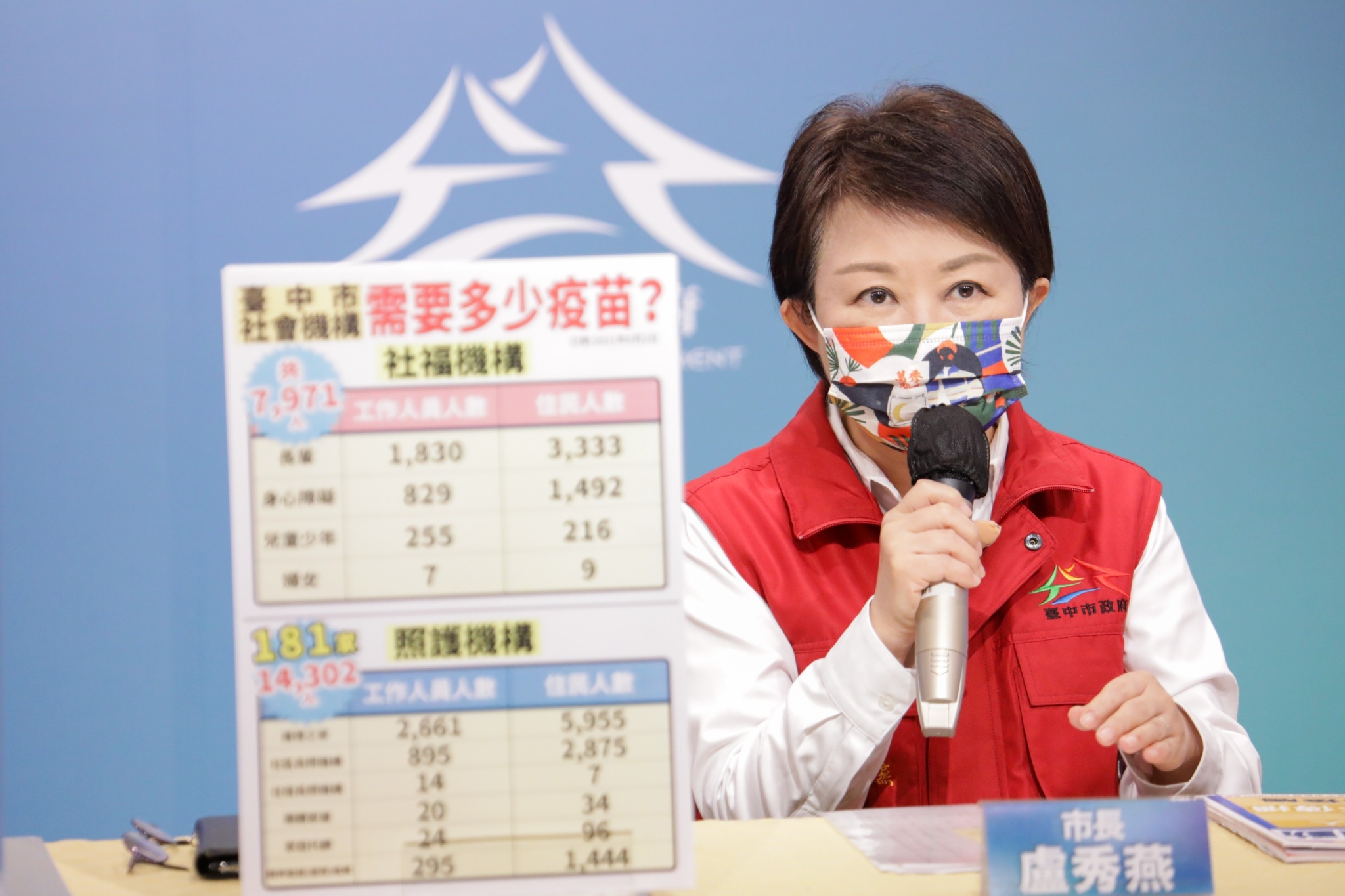 另外,盧市長指出,昨日台北市發生長照老人群聚7死的憾事,今日新北市又爆發長照機構25人群聚感染,根據統計,台中市社福及照護機構住民及工作人員超過2萬2000人,市府除加強機構防疫措施,也盼中央盡速撥補更多疫苗,將社福養護及長照機構的住民與工作人員列為優先施打對象,降低群聚感染風險。