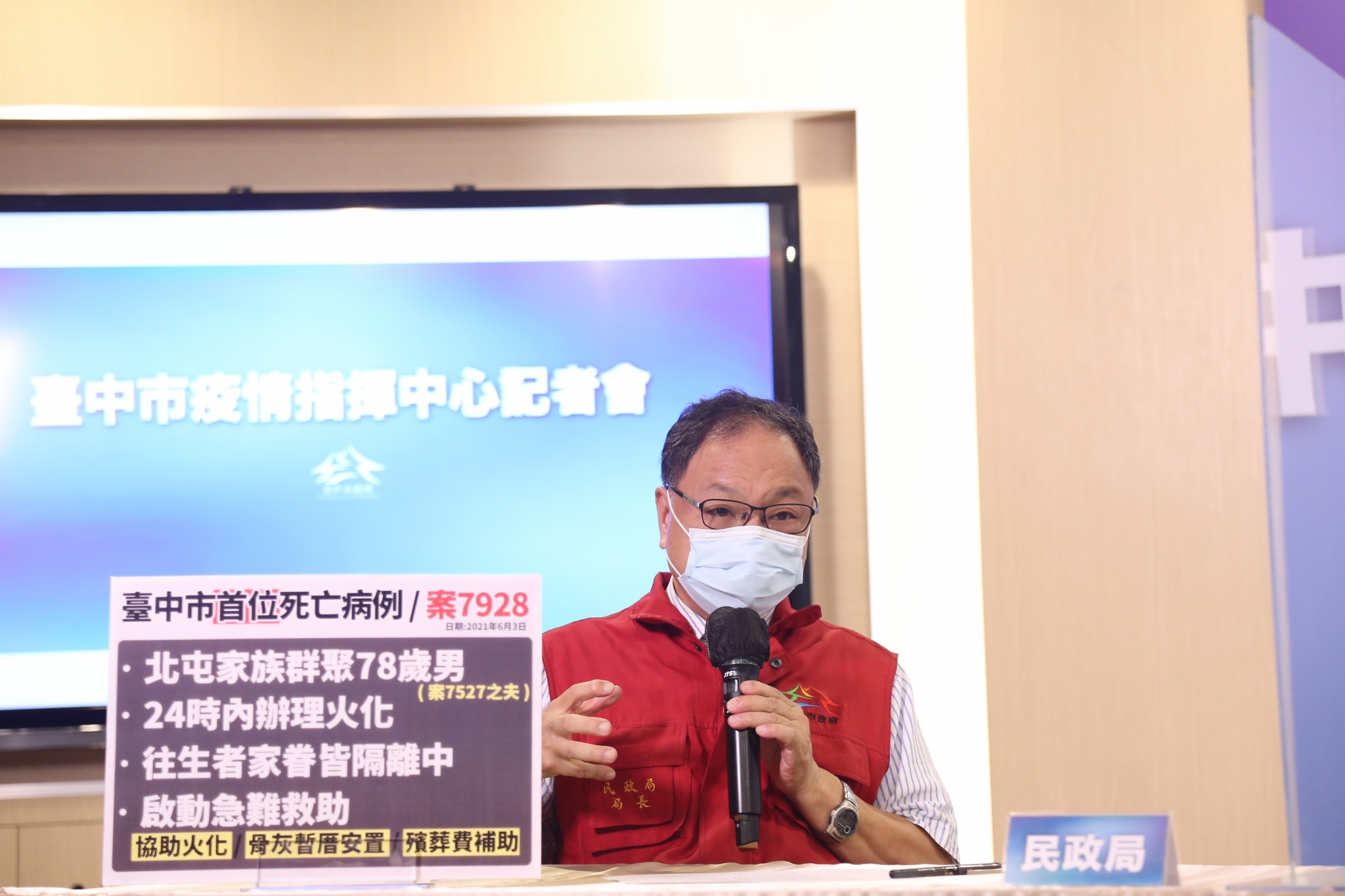 市府今日下午召開台中市流行疫情指揮中心線上記者會,盧市長提到,北屯大坑里家庭群聚首例老婦人的78歲先生(案7928),昨日傍晚不幸離世,考量家屬還在居家隔離中,無法親自處理喪葬事宜,她已指示民政局務必全力協助,包括依法火化後,會先送往殯儀館暫厝,待家屬居家隔離期滿,市府也會協助家屬處理喪葬相關事宜,幫助度過難關。