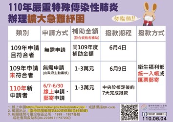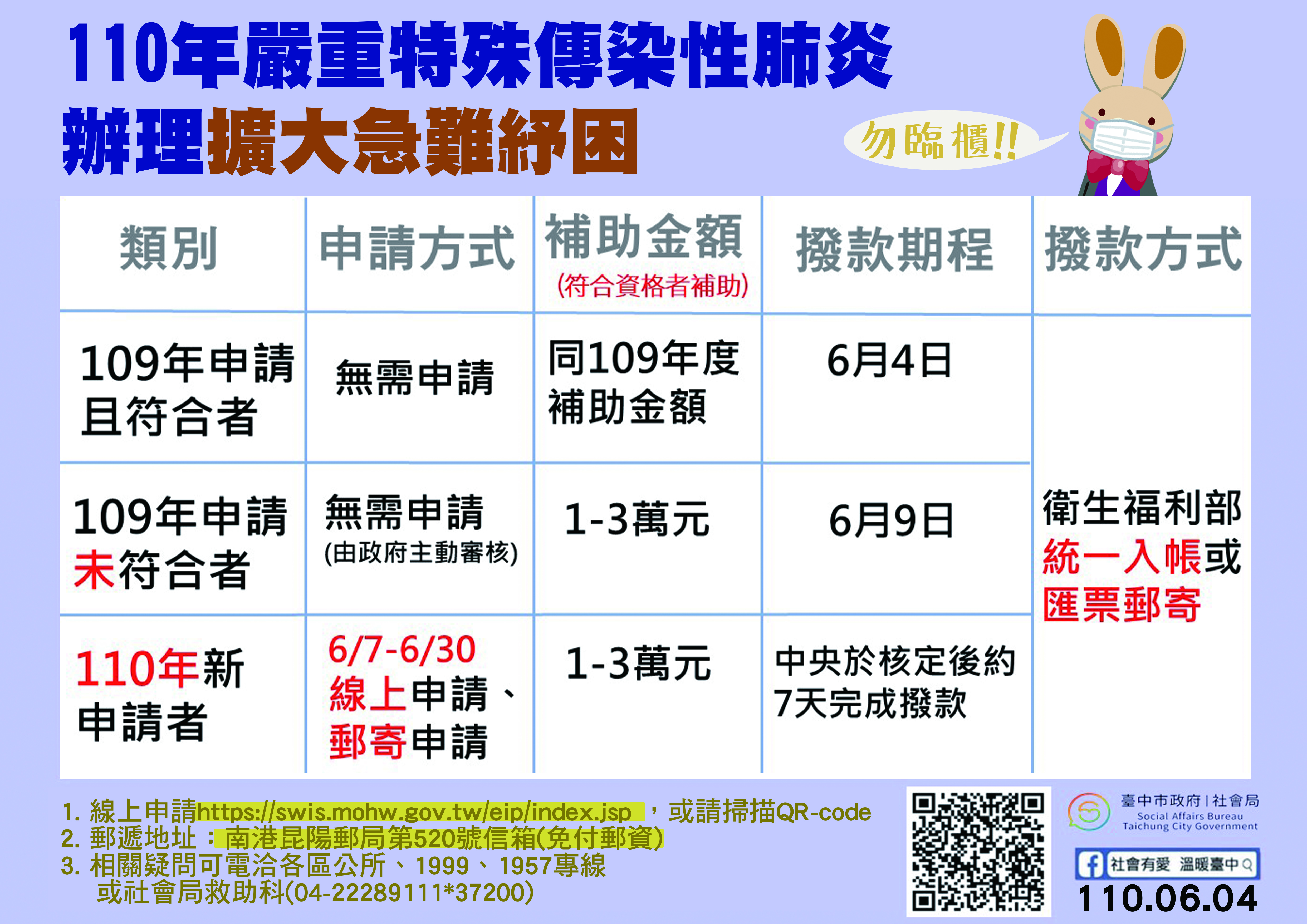 社會局說明,去年已領取擴大急難紓困且今年符合資格家戶,台中市有458件,總金額51168萬元,已於64日入帳。去年已申請但不符資格者,衛福部也會主動查調,如今年符合資格,完成核定後69日撥款。今年新申請案67日起至630日線上申辦( https://swis.mohw.gov.tw/eip ),民眾可多多利用,避免群聚感染風險,也加快審查速度;如無法使用線上申請,可郵寄相關申請文件至南港昆陽郵局第520號信箱(免附郵資)