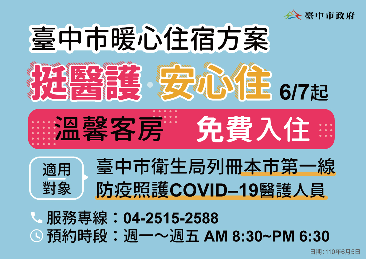 新型冠狀病毒疫情嚴峻,醫護人員站在防疫最前線,為體恤醫護人員辛勞,台中市政府結合各界資源推出醫護暖心住宿方案,針對衛生局列冊照顧COVID-19病患醫事人員,自6月7日開始提供免費住宿空間。市長盧秀燕表示,有家不敢回的一線醫護人員,可透過醫護暖心住宿旅館好好休息、好好睡覺,作為醫院與家庭的緩衝地帶,「台中不僅守護醫護,更力挺醫護!」