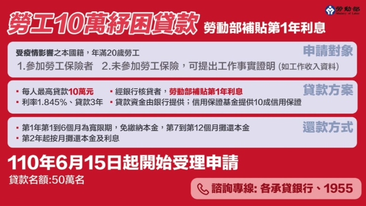 此外,為協助勞工度過難關,勞動部今年也續辦「勞工紓困貸款」。張局長指出,此項貸款對象為受疫情影響20歲以上本國勞工,每人貸款額度最高10萬元,貸款期限3年,並由政府補貼第1年貸款利息(貸款利率按郵局二年期定期儲金機動利率加1%,目前為1.845%),包括台灣銀行在內共35家承貸銀行,名單可至勞動部網站(https://bit.ly/3w0kvR8 )查詢,自615日起,免臨櫃可於各銀行官方網站申請,預計可協助50萬名勞工。