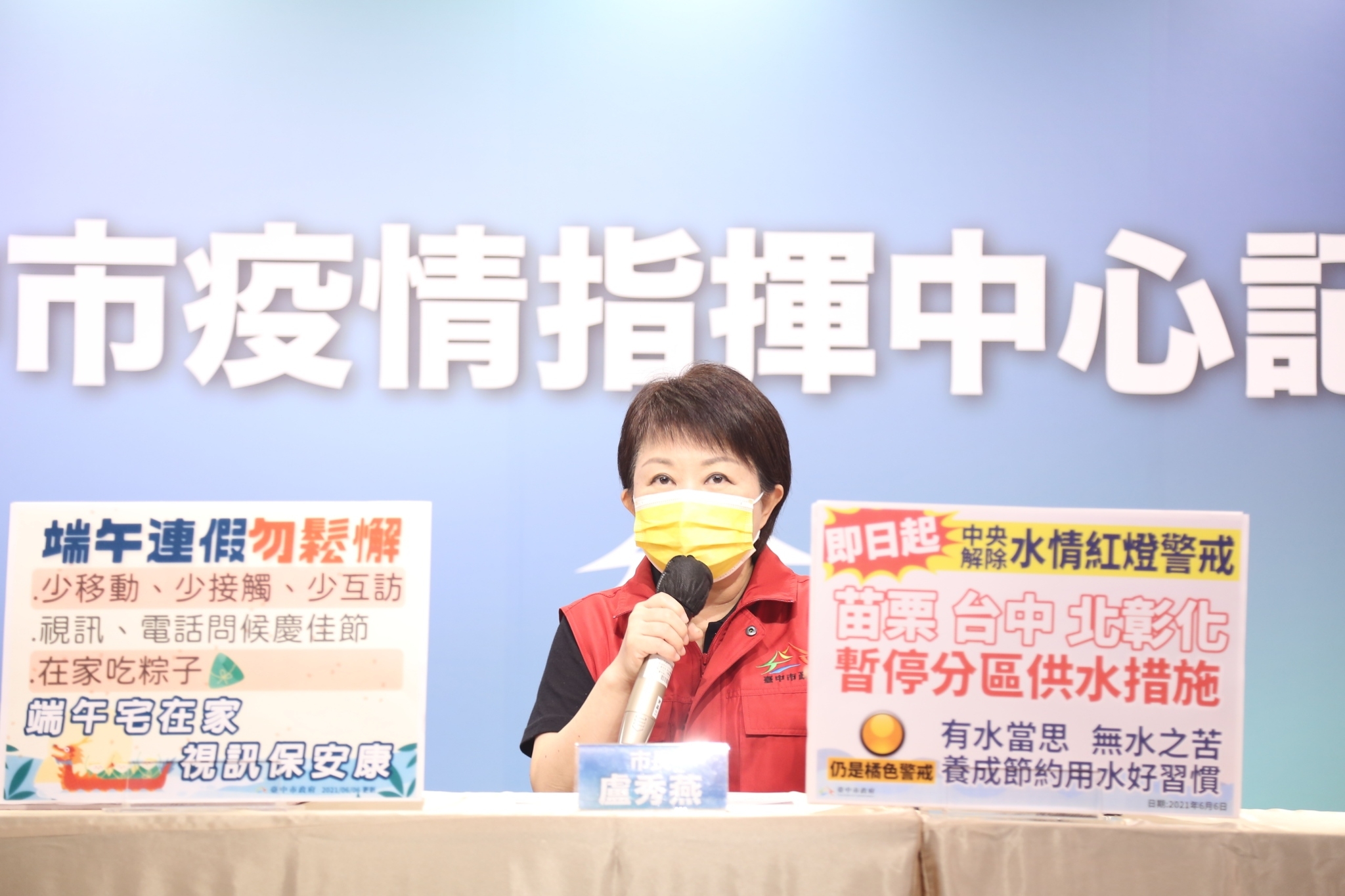 另外,盧市長也向大家報告好消息,她說,台中供五停二限水措施已於今日解除,日前她於台中市疫情指揮中心線上記者會邀請市民朋友一起集氣祈禱,希望這波梅雨能夠下好下對,現在願望成真,水庫有所進帳。上午經濟部長王美花也打電話向她說,自今日起取消台中限水措施,她非常感謝王部長,此外,由於王部長正在居家隔離中,祝福王部長早日解除隔離、保持健康。