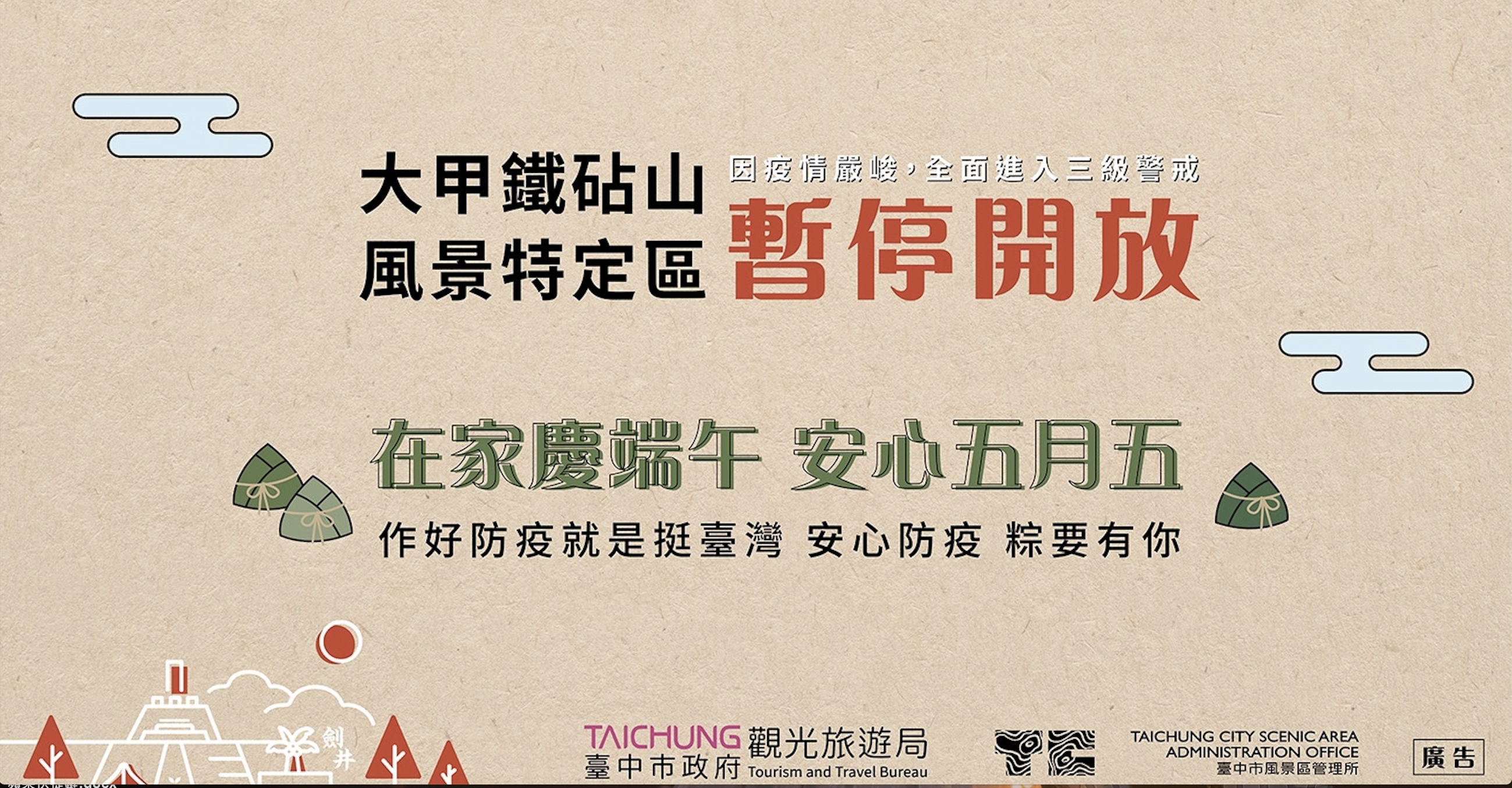 觀旅局提醒,為維護民眾健康,台中三大風景區包含大甲鐵砧山雕塑公園(含旅服中心)、大坑12條登山步道、大安濱海樂園(含沙灘區)等場域,端午連假三天皆暫停開放,呼籲民眾在家防疫,健康第一,封閉情形將視疫情發展,配合中央流行疫情指揮中心發佈政策滾動調整。更多詳細活動訊息,請上大玩台中與台中市風景區管理所臉書粉專查詢。(6/8*18)*觀光旅遊局