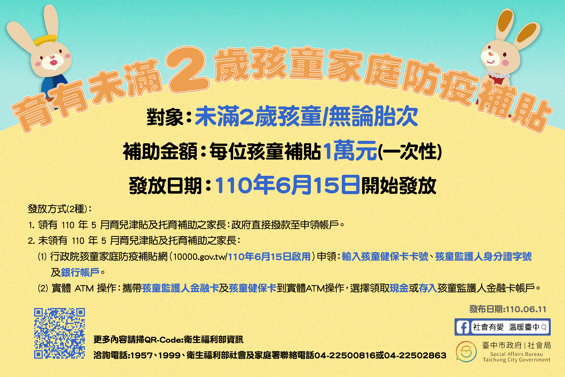 社會局說明,家中幼兒若於三級疫情警戒解除前出生,並完成出生或初設戶籍登記,家長可領取一次性補貼1萬元。若家長領有今年5月育兒津貼及托育補助,政府直接撥款至申領帳戶;如未領有今年5月育兒津貼及托育補助,可持孩童監護人金融卡,透過專屬網站或ATM領取現金1萬元。