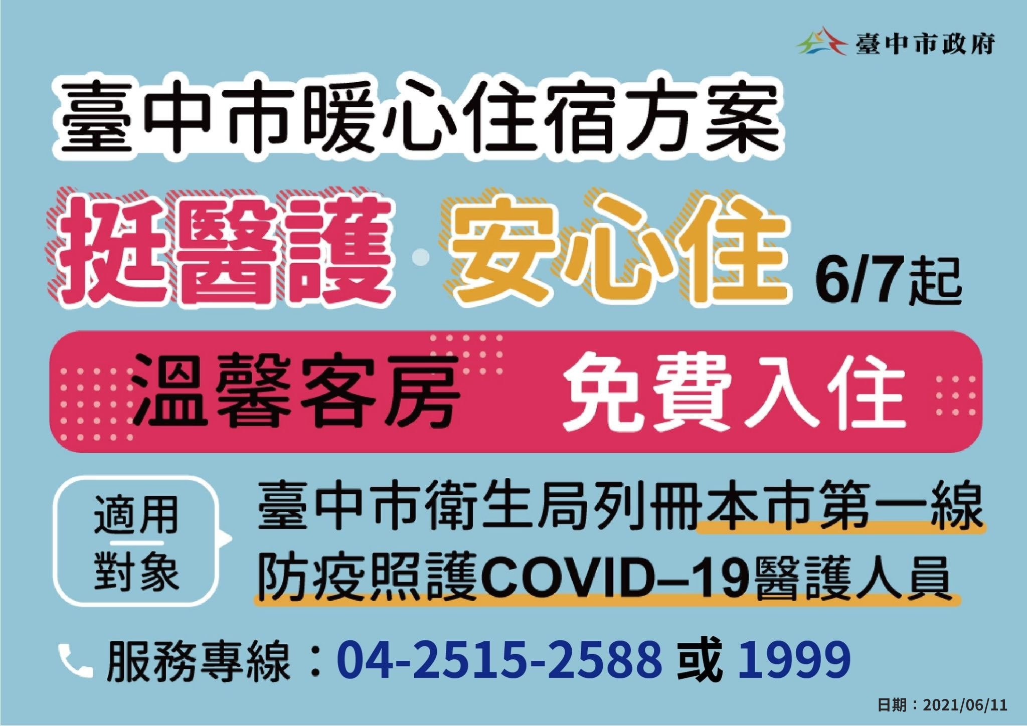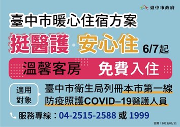盧市長今日下午主持台中市流行疫情指揮中心線上記者會表示,第一線醫護人員照顧COVID-19病患相當辛苦,因擔心傳染風險有家歸不得,為體恤醫護人員防疫辛勞,市府自67日起媒合旅宿業者成立「醫護暖心住宿」專案,讓符合資格的台中醫護人員免費入住,「醫護守護台中,我們守護醫護!」