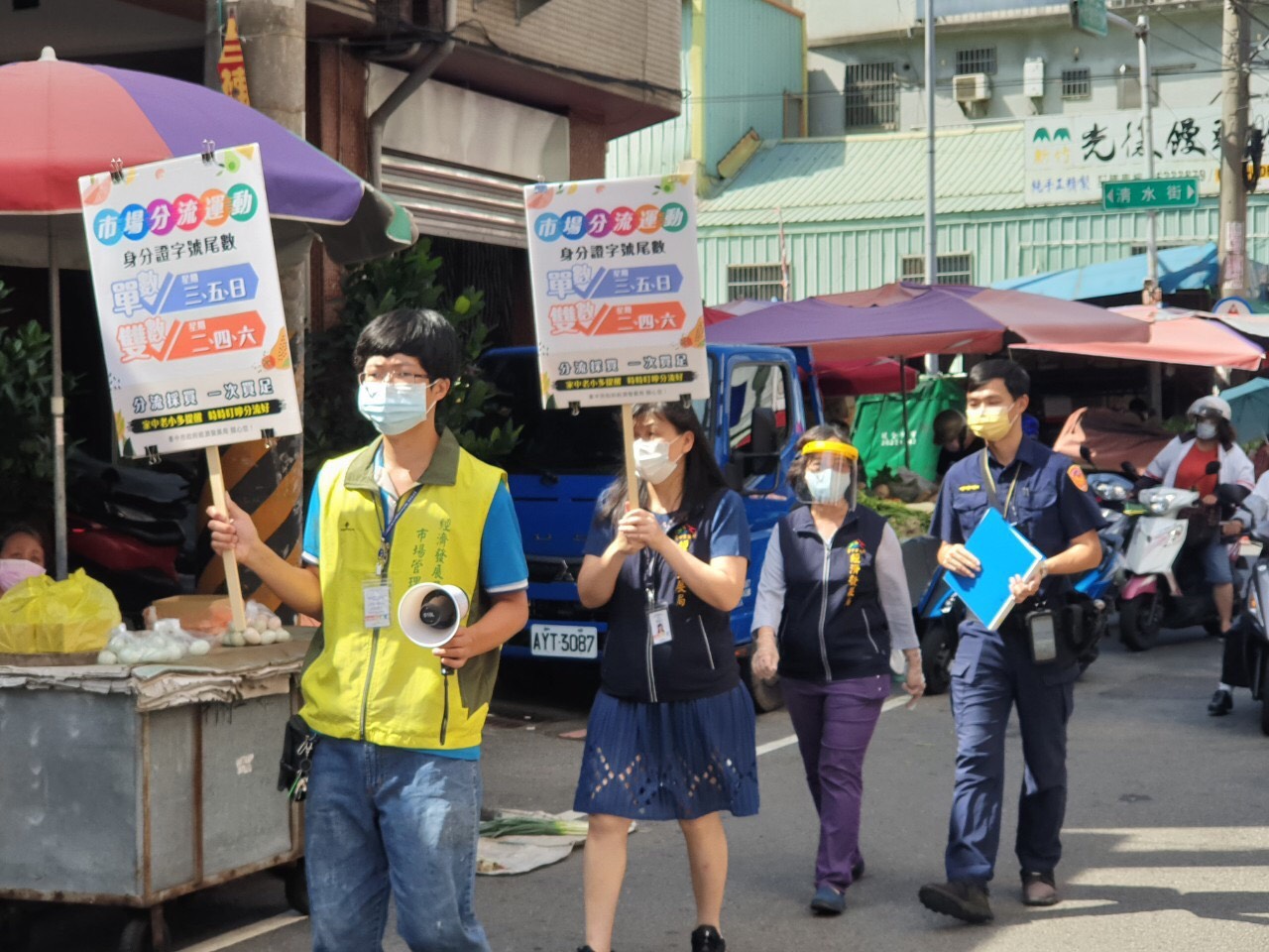 因應端午連假避免人潮群聚,台中市政府經發局要求全市42處公有市場加強各項防疫工作,市府同時啟動擴大稽查機制,由經發局副局長李逸安等帶隊,會同警察局至清水第一、沙鹿、南屯等9大熱點傳統市場內及外攤區加強擴大區域稽查及宣導,查核民眾口罩佩戴情形,提醒民眾落實實聯制及保持社交距離,即時勸離取締。