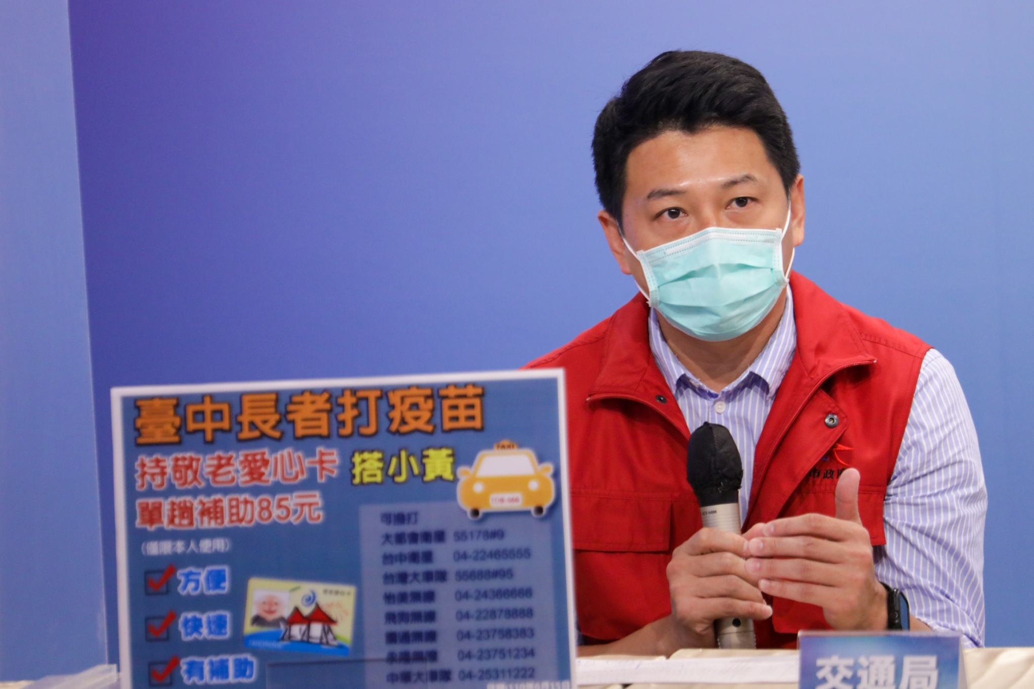 交通局長葉昭甫表示,年長者外出施打疫苗可多利用台中市計程車,持「敬老愛心卡」單趟可抵扣85點,目前參與服務車隊共有8家、全市超過4,300輛繼計程車合作。此外,若是身心障礙者及搭乘輪椅乘客等行動不便民眾,也可使用台中市通用計程車,讓外出施打疫苗更方便。搭乘計程車前請先撥打電話預約。
