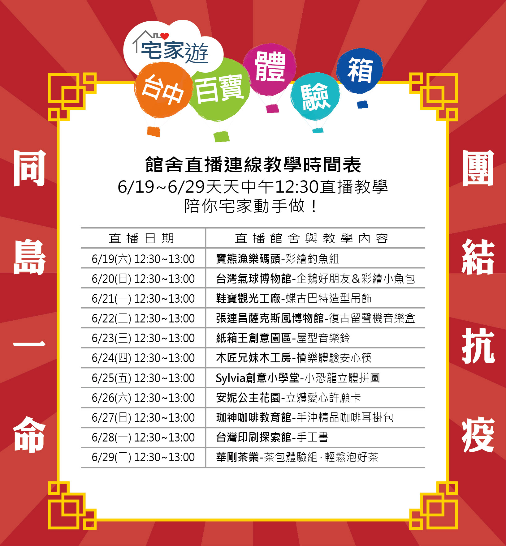 全國疫情三級警戒,重創觀光產業,為緩解產業負擔,台中市政府觀光旅遊局盤點觀光資源,與台中產業故事館發展協會合作,整合觀光工廠、創意生活與地方文化館等業者,並媒合線上電商平台在疫情期間推出「宅家遊台中--百寶體驗箱」,將在地體驗打包搬到家中,讓家長和孩子在家也能一起暢遊台中特色產業館,體驗各項手作DIY樂趣。
