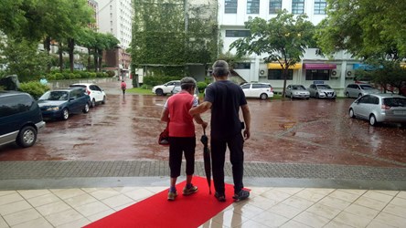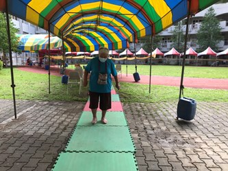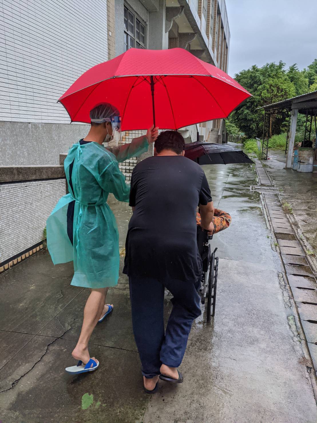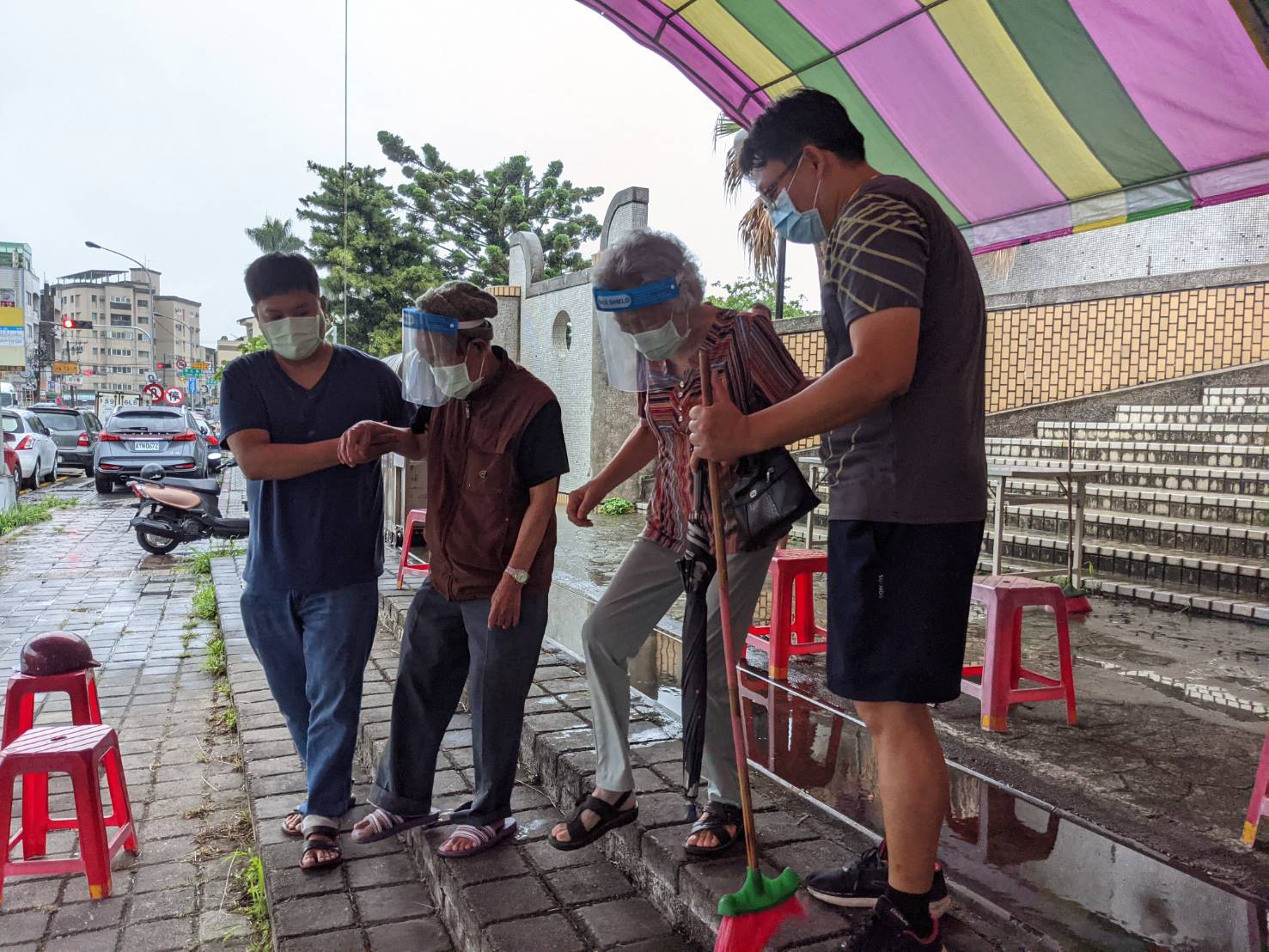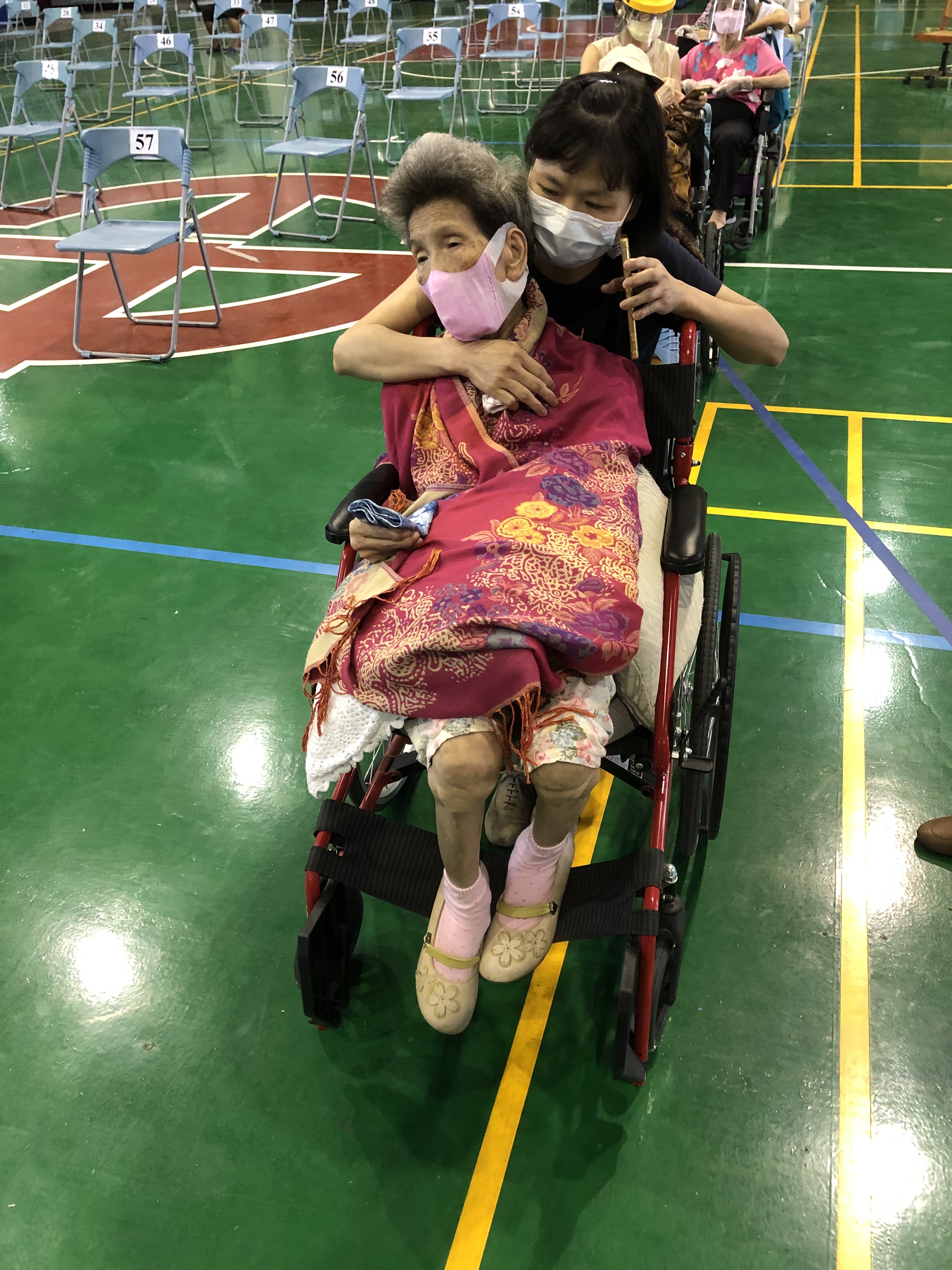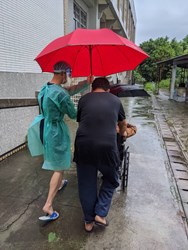 吳局長說明,這兩天行動不便或乘坐輪椅前往快打站接種的的長者為數不少,工作人員擔心降雨會增加老人家跌倒風險,除了幫忙撐傘溫柔攙扶,也會充當長輩的拐杖給予扶持,減少長者行動的不便。此外,太平區快打站也在地面積水處鋪設防滑地墊及無障礙止滑斜坡,北區五權國中快打站也鋪設塑膠止滑紅地毯,讓施打疫苗的流程不致受降雨影響,更讓到場施打疫苗的長者及家屬備感暖心。