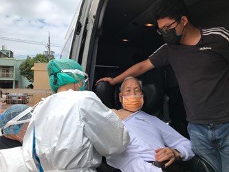 而神岡區神岡國小快打站更是接獲賴姓民眾表示,高齡父親因中風行動不便,且無法使用輪椅移動,雖能選擇到府施打,但尚須等候排程,由於想儘早讓父親完成疫苗接種,希望快打站提供車內施打服務。「市民朋友的需求我們聽見了!」快打站工作團隊立即聯繫安排,讓賴姓民眾陪伴癱坐車內的賴老先生抵達現場,林政益小兒科診所王敬誠醫師團隊隨即在車門邊為賴老先生進行健康評估並順利完成疫苗注射,快打站團隊以同理心面對家屬的請求,積極、彈性、權宜解決鄉親問題,竭盡全力為市民服務,賴姓民眾也感謝快打站團隊的協助。