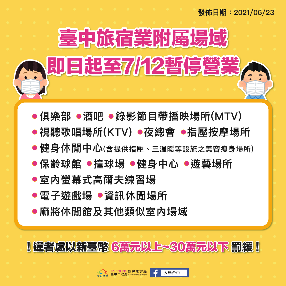 觀旅局補充,為避免造成防疫破口,台中旅宿業附屬場域也持續暫停營業至7月12日,包括俱樂部、酒吧、錄影節目帶播映場所(MTV)、視聽歌唱場所(KTV)、夜總會、指壓按摩場所、健身休閒中心(含提供指壓、三溫暖等設施之美容瘦身場所)、保齡球館、撞球場、健身中心、室內螢幕式高爾夫練習場、遊藝場所、電子遊戲場、資訊休閒場所、麻將休閒館及其他類似室內場域)。請民眾配合暫緩涉足,以確保自身及他人安全,共同為防疫盡一份心力。草悟廣場富地市集暫停營業至110年6月30日,後續將進行內部整理。