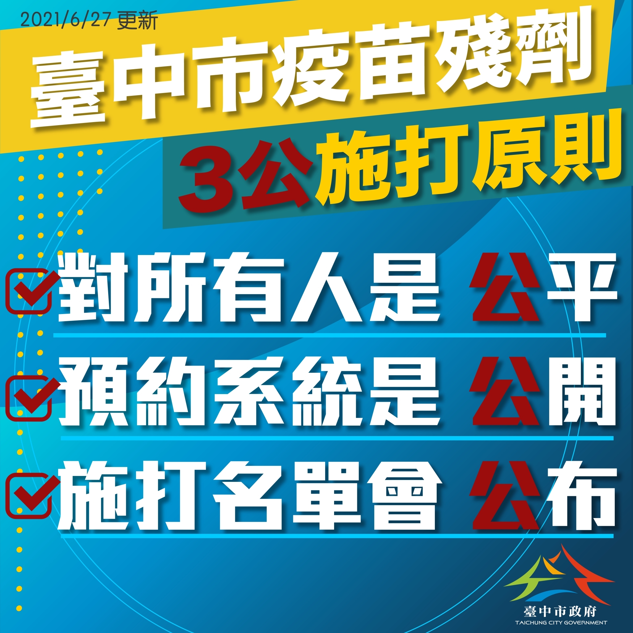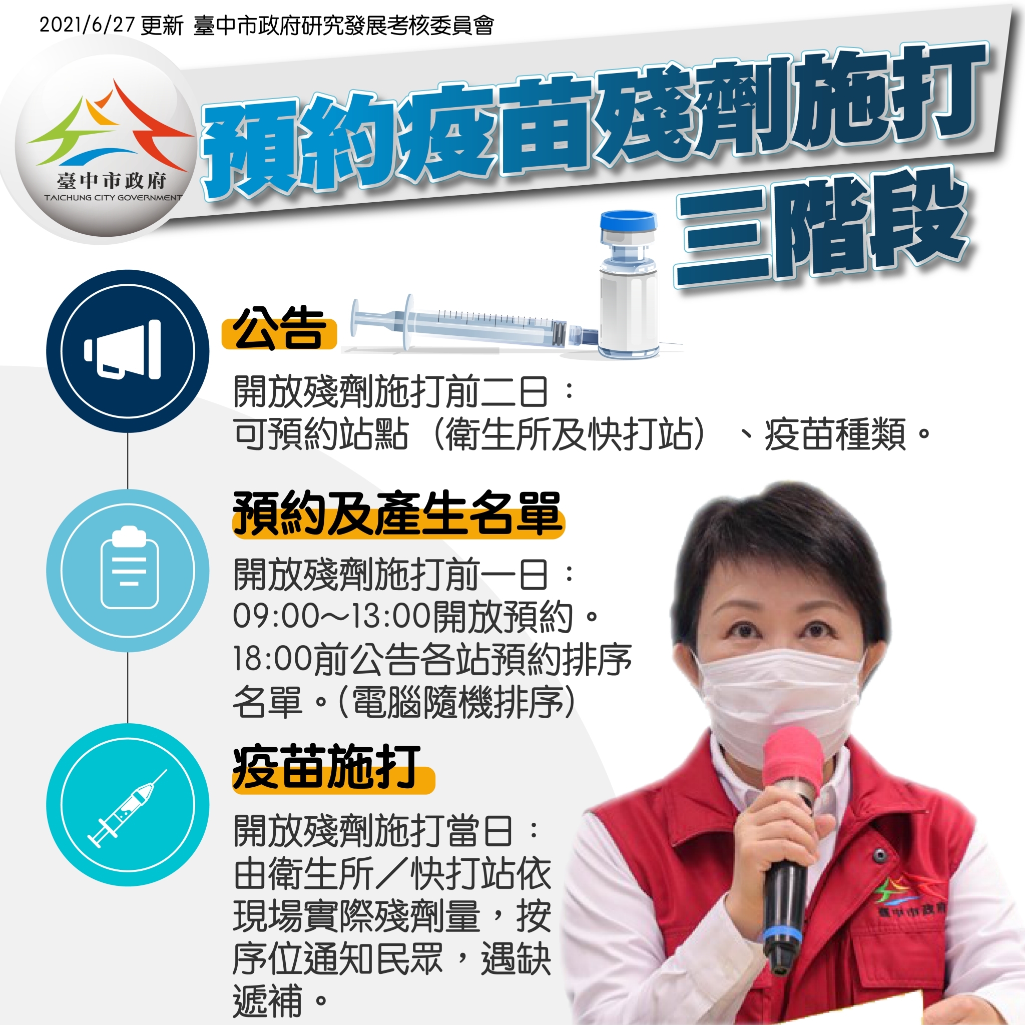 配合中央公布每日最後一瓶疫苗「殘劑」施打之最新指引,中市府以盧秀燕市長堅持的公正公開原則,並站在民眾需求角度著想,市府研考會及資訊中心透過跨局處研商方式,第一時間創訂線上登記流程,並預計於6月28日(一)公告「台中市新冠疫苗殘劑施打資訊網」正式上線。