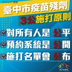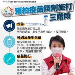 吳主委另補充,「台中市新冠疫苗殘劑施打資訊網」預計於6月28日正式上線,其公告提供的預約施打站點以本市衛生所及快打站為主,醫療院所、診所部份則應遵照中央發佈之指引及市府衛生局規定為民眾施打。