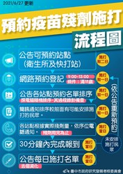吳主委表示,首先第一階段,因應中央每批次配送之疫苗數量,預計於開放殘劑施打前兩日公告可預約的衛生所或快打站,以及疫苗種類;接著第二階段,在施打前一日上午9點至下午1點開放有意願的民眾登記預約,該日下午6點前將各站點預約名單以電腦亂數排序後公告於網站,同時以簡訊通知排序較前面有可能被安排施打的民眾留意;最後第三階段,施打當日各站點指揮官將依現場實際的殘劑數量按序位電話聯絡通知民眾施打,並於網站公告每日殘劑的施打名單。