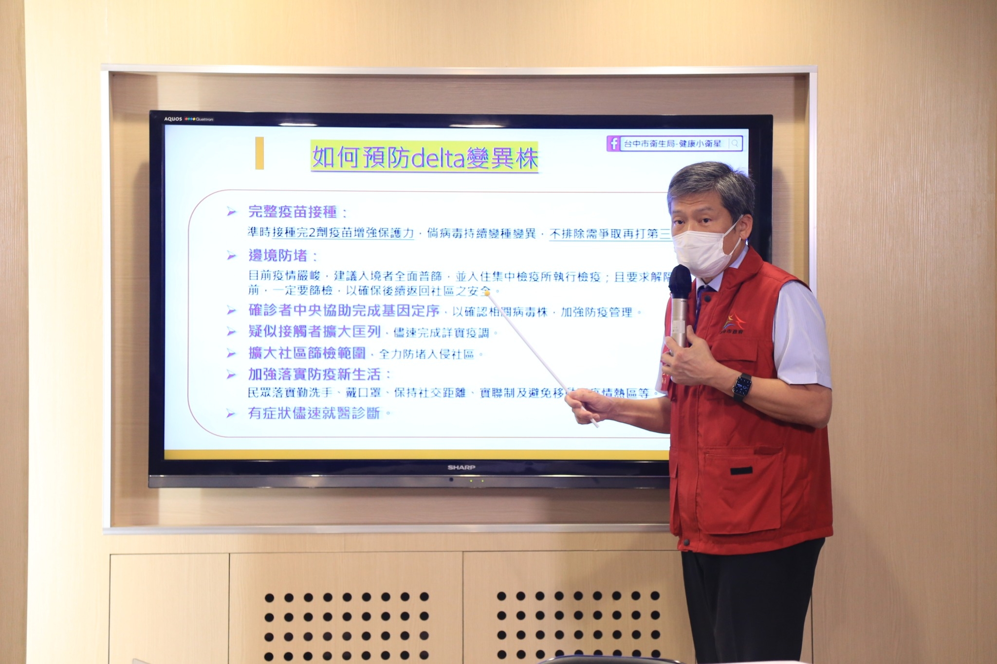 針對印度變種病毒Delta入侵台灣,盧市長說明,經市府查證,目前為止Delta病毒相關確診個案12人足跡並未進入台中,但市府會持續追蹤;由於Delta變異病毒株傳播力強,且症狀似重感冒,患者會出現頭痛、喉嚨痛、流鼻水、發燒、咳嗽等情況,若民眾出現類似症狀,必要的話需篩檢確定是否染疫,為避免染疫風險,呼籲民眾少外出降低風險、佩戴口罩、勤消毒雙手,並落實家庭防疫新生活。