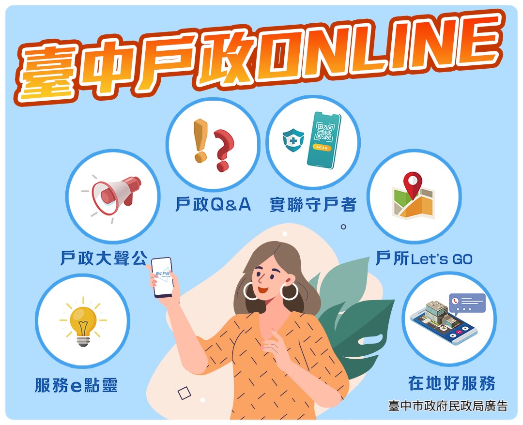 民政局指出,「台中戶政ONLINE」官方平台提供6大功能服務,「戶政大聲公」透過圖文推播,宣導各項戶政業務及重要政策,並即時更新戶政法規資料;「戶政Q&A」自動回應機器人,即時解決民眾一般洽辦之戶政相關問題,也貼心提供台中市人口統計問答查詢;而「戶政Let’s GO」及「在地好服務」並提供台中市及全國跨區戶政機關通訊指引及鄰近戶所導航;此外,「服務e點靈」整合了台中市服務e櫃台、台中市戶政規費查詢、台中e指通數位市民平台、台中市人口統計平台及內政部戶役政線上申辦等連結服務。
