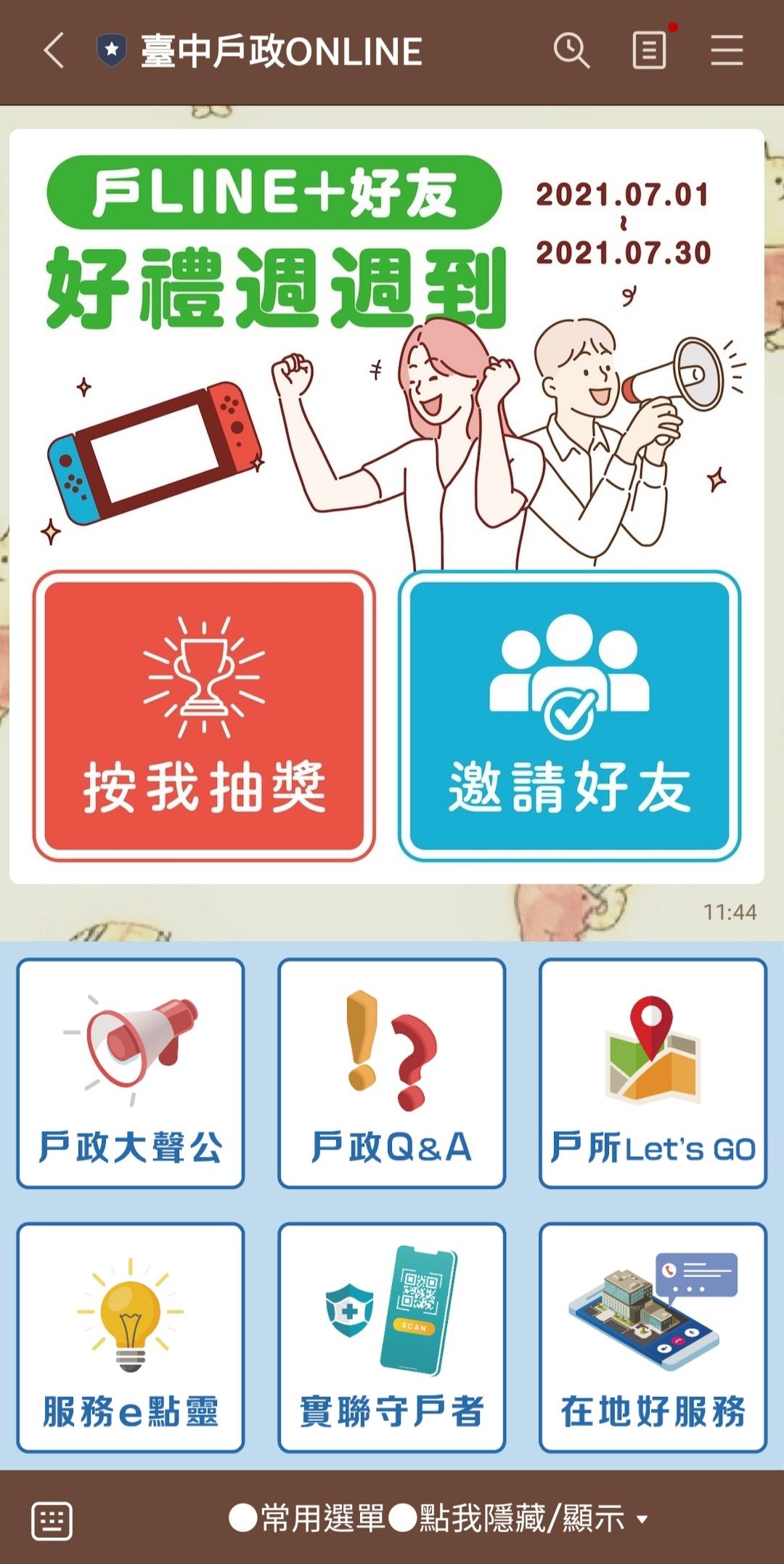 此外,因應時下防疫需求,並開發「實聯守戶者」,連結疾管家實聯掃描、台中市防疫專區及台中居家檢疫替代所申請,民眾按下手機一指即達,有效即時又實用便民,歡迎民眾踴躍加入「台中戶政ONLINE」官方帳號好友。(7/1*8)*民政局