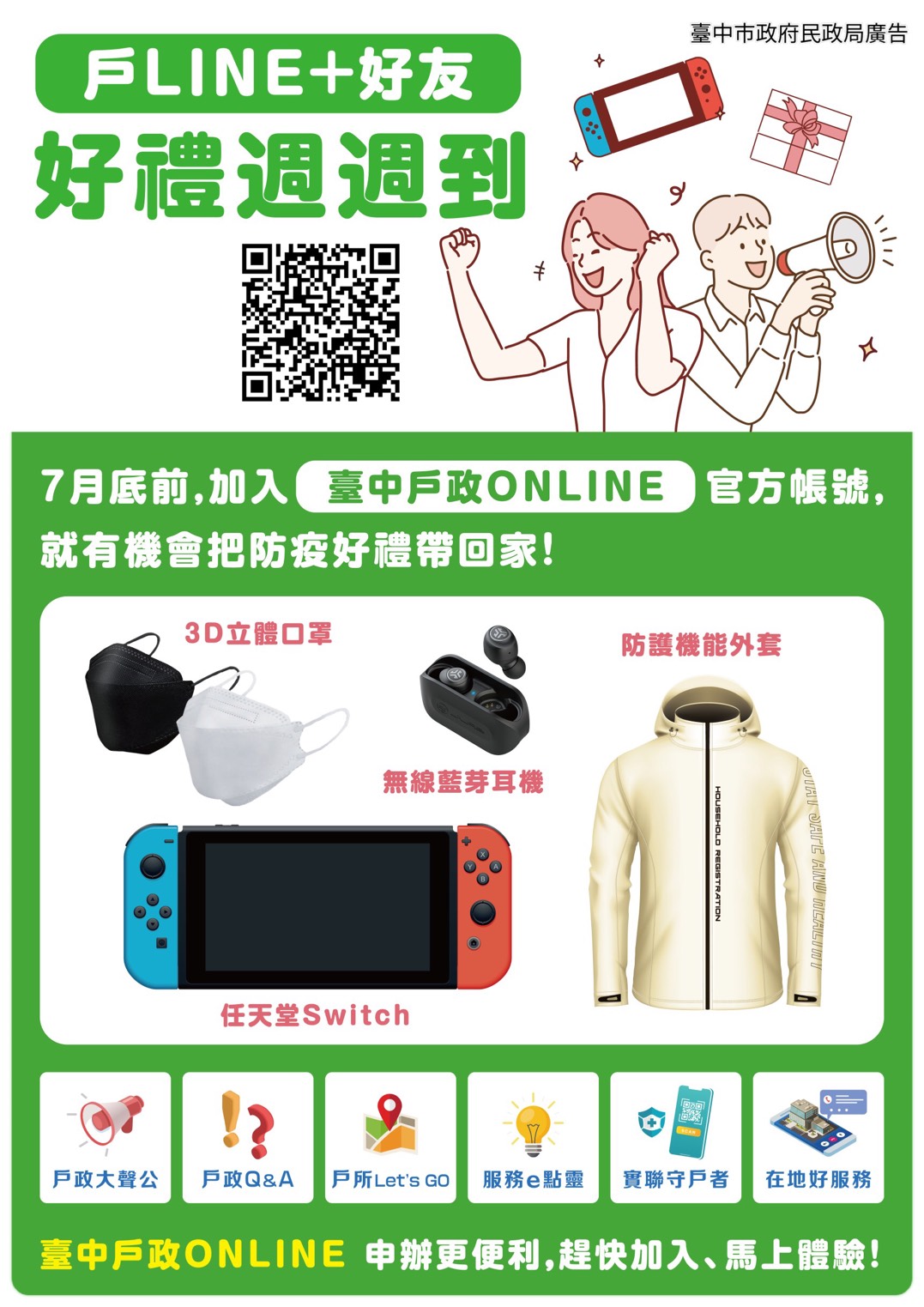 民政局長吳世瑋表示,「台中戶政ONLINE」擴大服務對象至全台中市,甚至跨縣市戶政整合性服務,其中6大主題功能,並根據第一線戶政人員長期服務經驗,站在民眾實際需求設計規劃,今(1)日至7月30日加入官方帳號好友,即有機會獲得任天堂switch主機、紀念款專屬防護外套、藍芽耳機、防疫3D立體造型口罩及乾洗手攜帶組等多項豐富好禮,歡迎民眾多加利用。