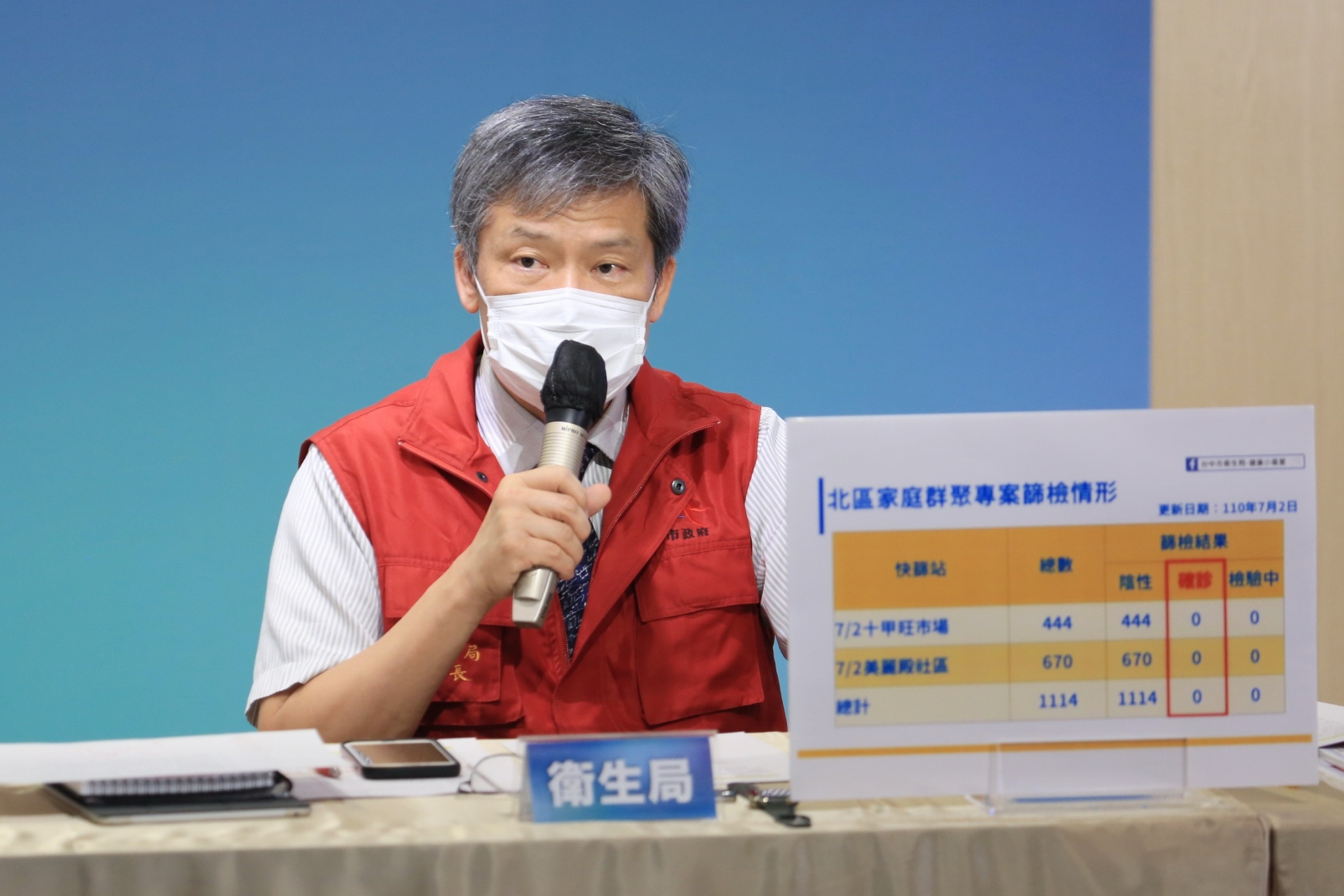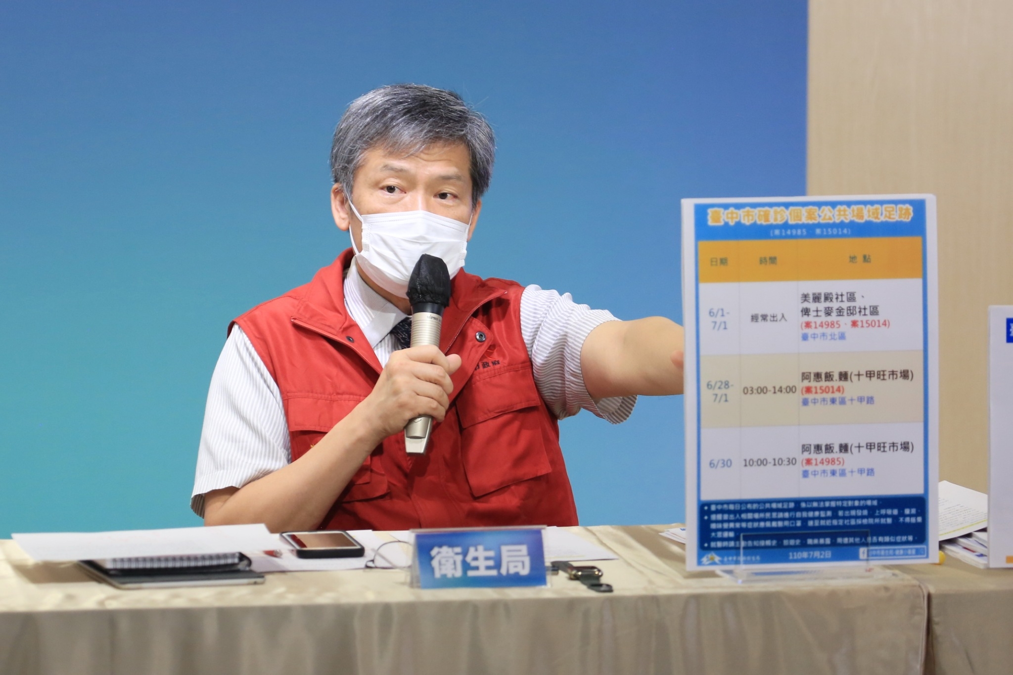 衛生局長曾梓展說明今日確診案例疫調情形,案14985為北區72歲男性,平時會至東區十甲旺市場麵店幫忙,有肺積水、高血壓及心血管病史,平常因慢性病史有呼吸困難及喘的情形,6月21日開始病情加劇,幾乎在家休息,30日曾到十甲旺市場,但因身體不適僅短暫停留又搭計程車回家休息,7月1日因呼吸喘,在朋友協助下由119救護車送至急診,經PCR檢驗確診,目前插管治療中,疫調由其家屬代為說明,市府持續釐清感染源。