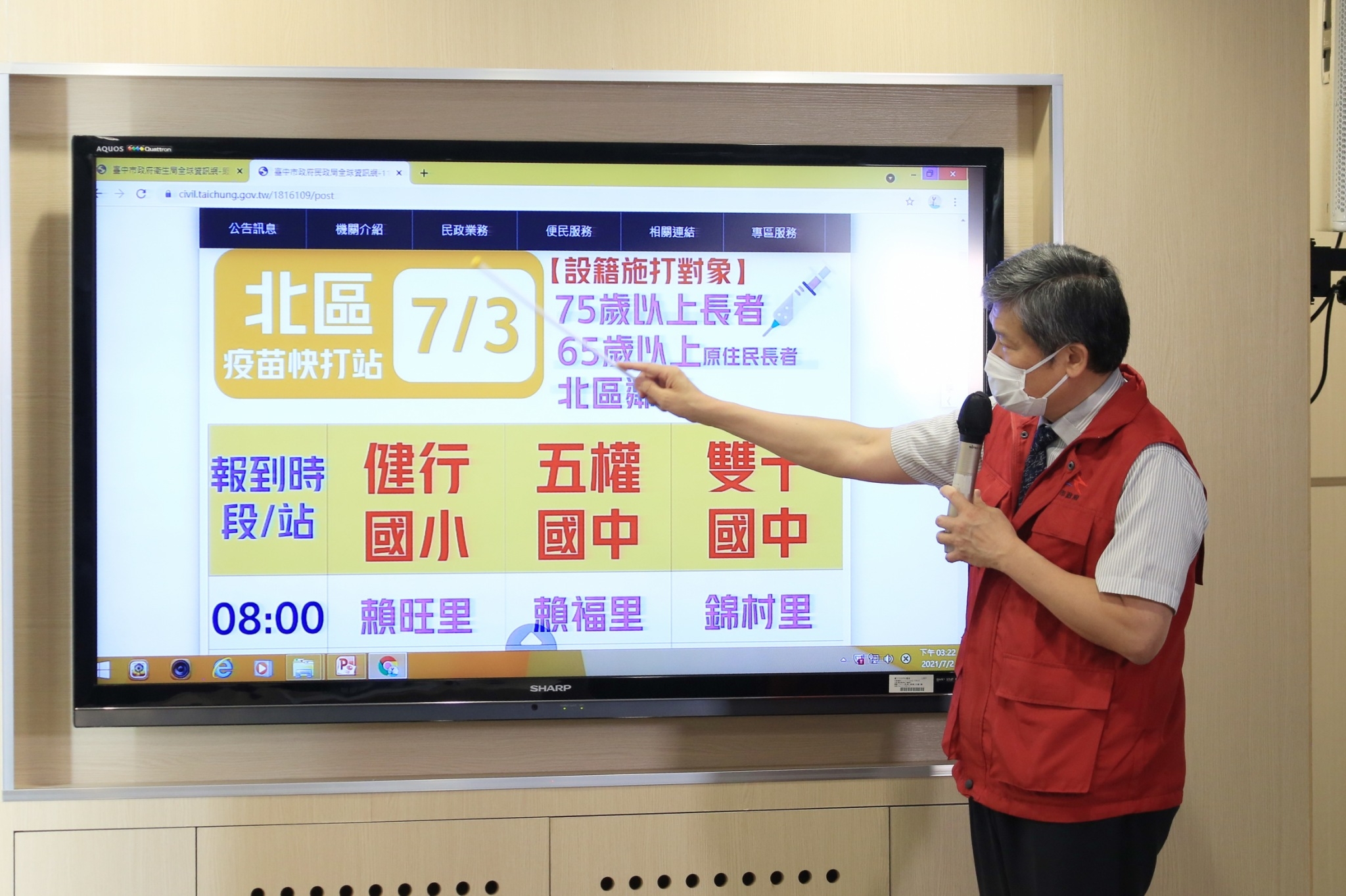 此外,盧市長說明,台中18家專責醫院今日起也已開設「COVID-19 疫苗專責門診」,為1至6類對象及75歲以上長者提供疫苗預約接種服務。全市67處快打站也將於明、後兩日登場,開放已造冊但尚未施打的75歲以上長輩接種,這次「不會另外發新的通知單」,長輩只要持過去發放的通知單,前往所屬鄰近快打站施打即可,市府已委請里長、鄰長協助告知長輩施打時間。