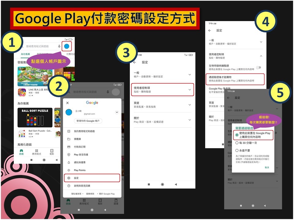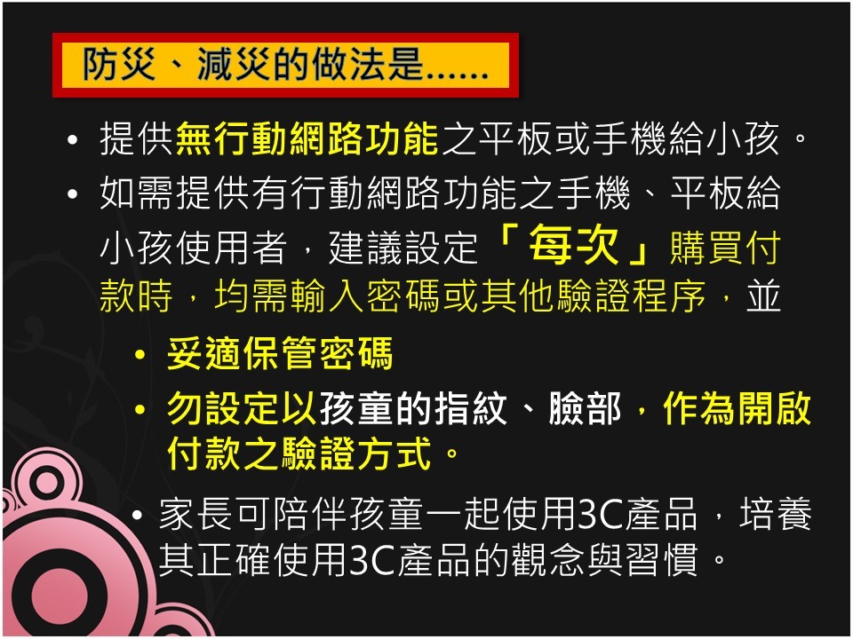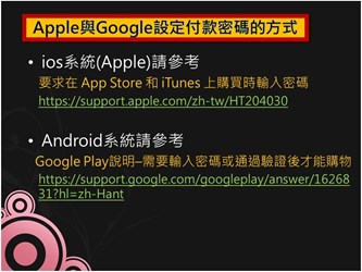 法制局長李善植說,如民眾有網上消費習慣,務必於電子3C配備中,設定「每次」購買付款,「均須」輸入密碼或其他的驗證程序,以減少小孩誤觸「付款」的風險,尤其線上遊戲的付費儲值,極容易產生鉅額帳單。