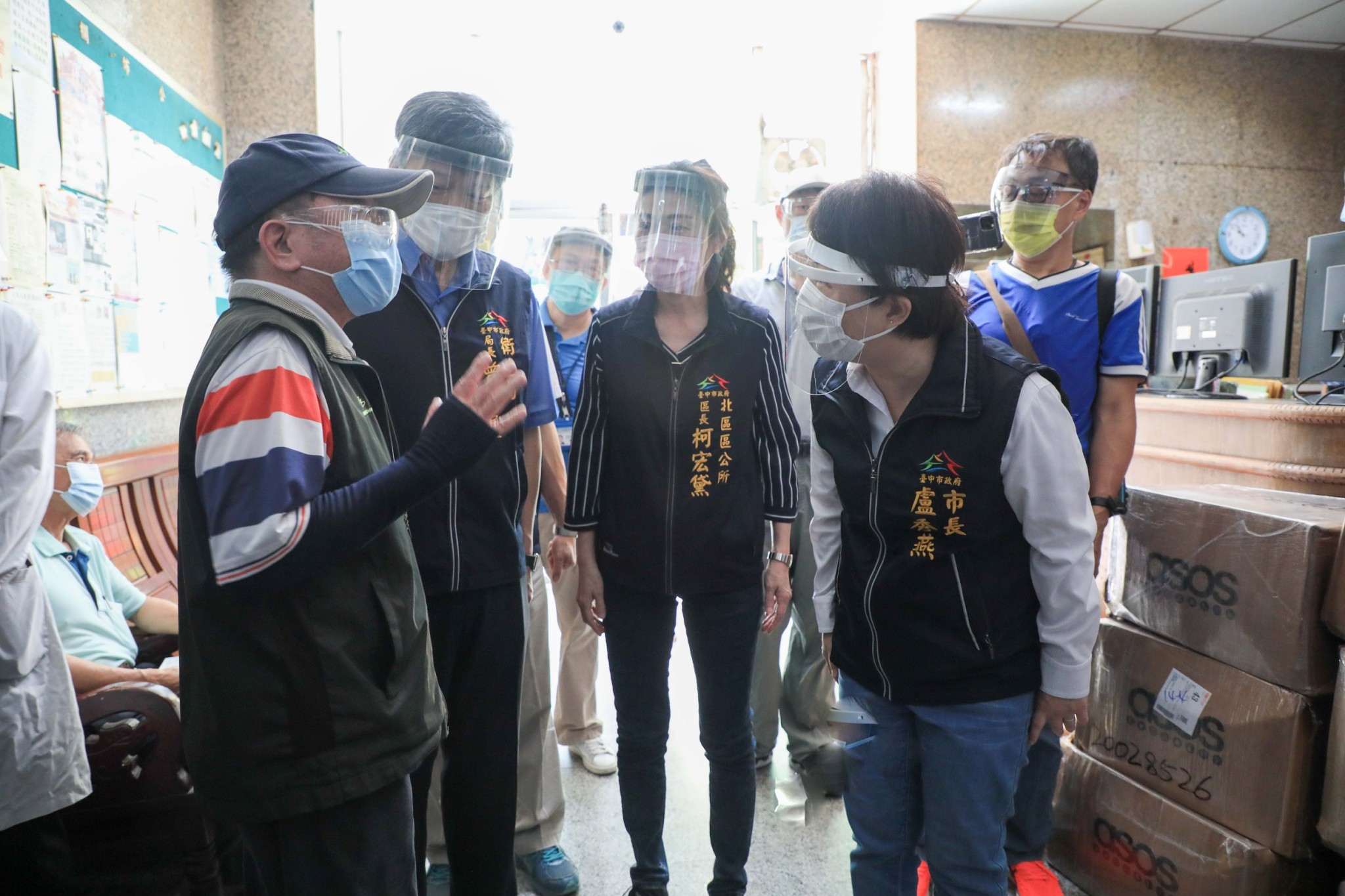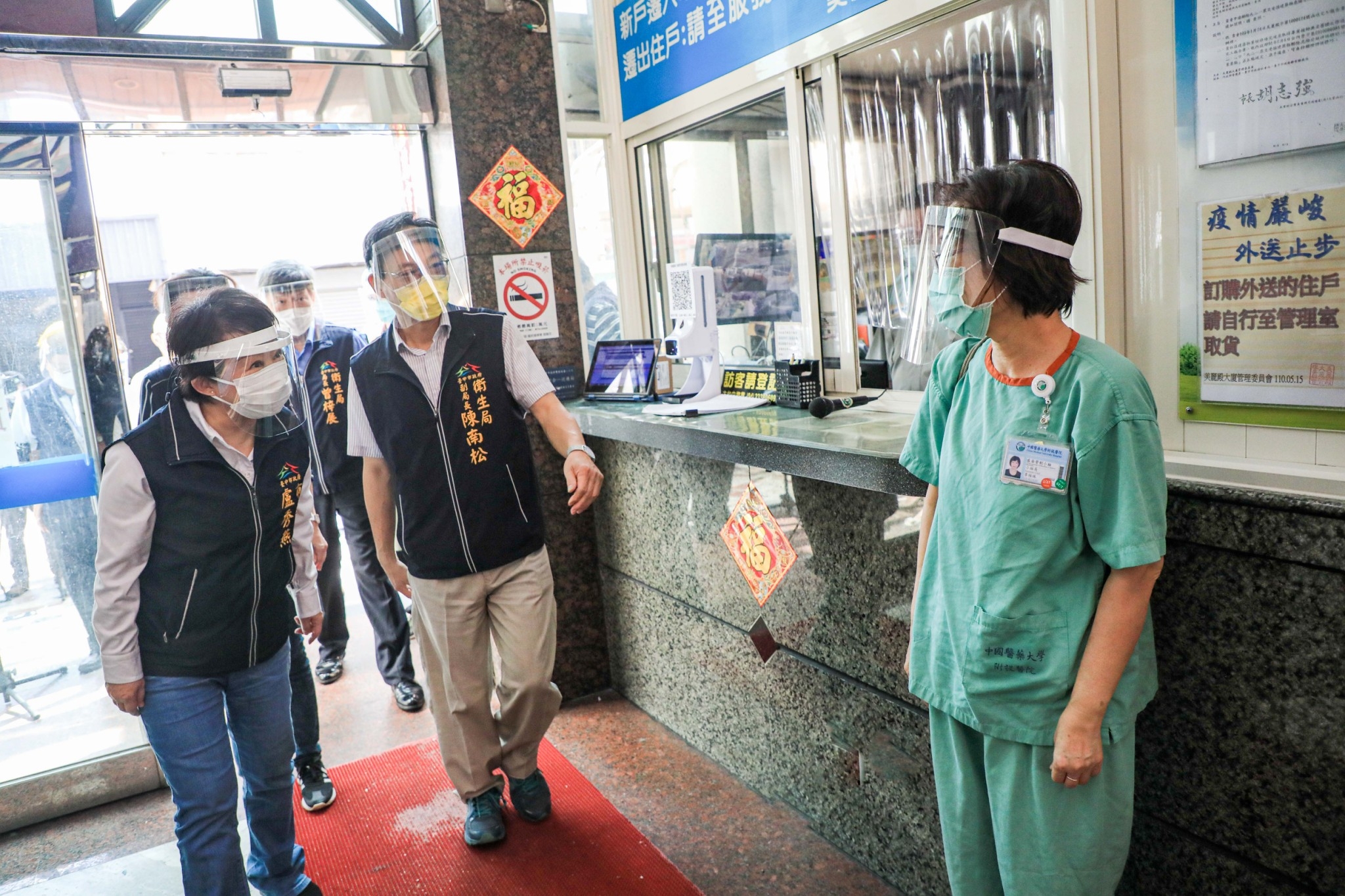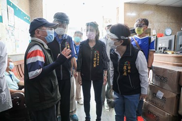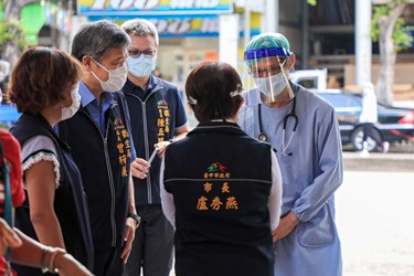 盧市長視察美麗殿快篩站後,前往斜對面的俾士麥金邸,以廣播呼籲民眾來篩檢,全力圍堵疫情;她也特別感謝中國醫藥大學附設醫院、衛生局、民政局等辛苦為市民服務,也感謝管委會的配合。