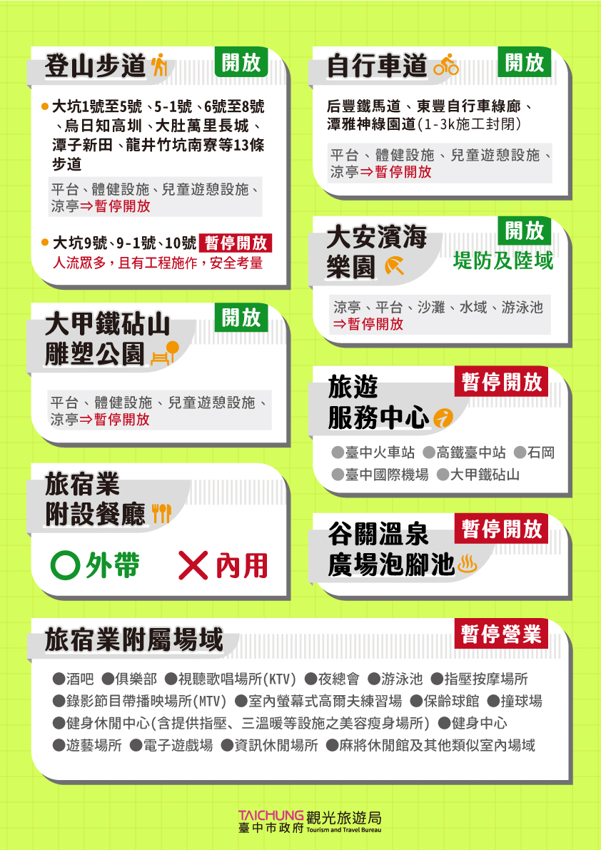 登山步道(1)大坑9號、9-1號、10號步道屬主要觀光遊憩據點,人流量相當大,同時又有養護工程施作中,為維護市民安全,維持封閉。(2)大坑1號至5號、5-1號、6號至8號、大肚萬里長城、龍井竹坑南寮、烏日知高圳、潭子新田等13條步道開放,但步道附屬之涼亭、平台、體健設施、兒童遊憩設施維持暫停開放。